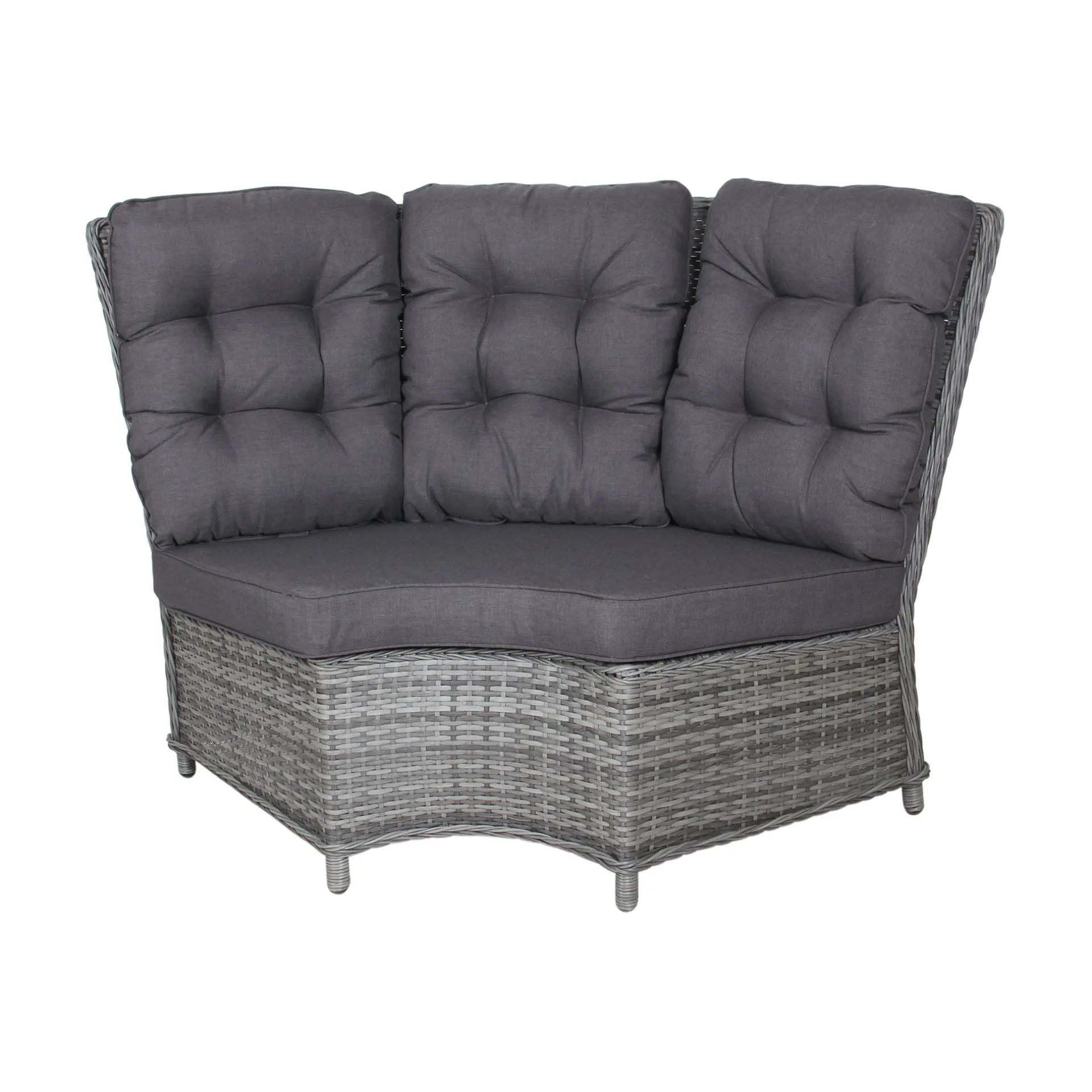 De Bank Hoek Rond Sicura Willow Grey combineert een roestvrij aluminium frame met onderhoudsvriendelijk kunststof vlechtwerk dat UV-bestendig is. De inbegrepen comfortabele kussens van luxe geweven stof maken deze bank een stijlvolle keuze voor binnen- en buitengebruik.