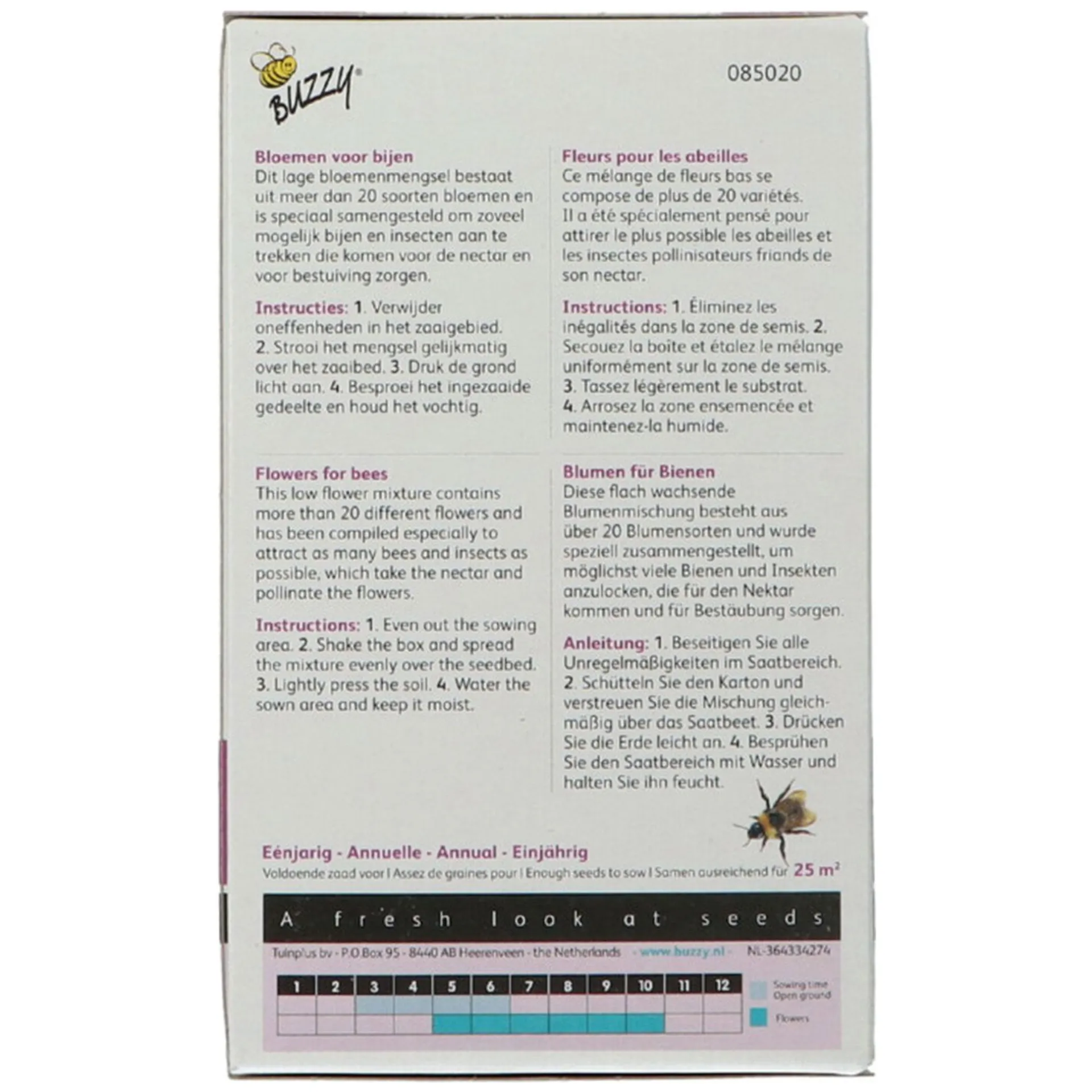 Perfect voor het creƫren van een bloemenhoek die bijen aantrekt en de bestuiving bevordert. Het mengsel bevat diverse bloemen die het hele seizoen kleurrijk bloeien. Geschikt voor tuin, balkon of bloembed.