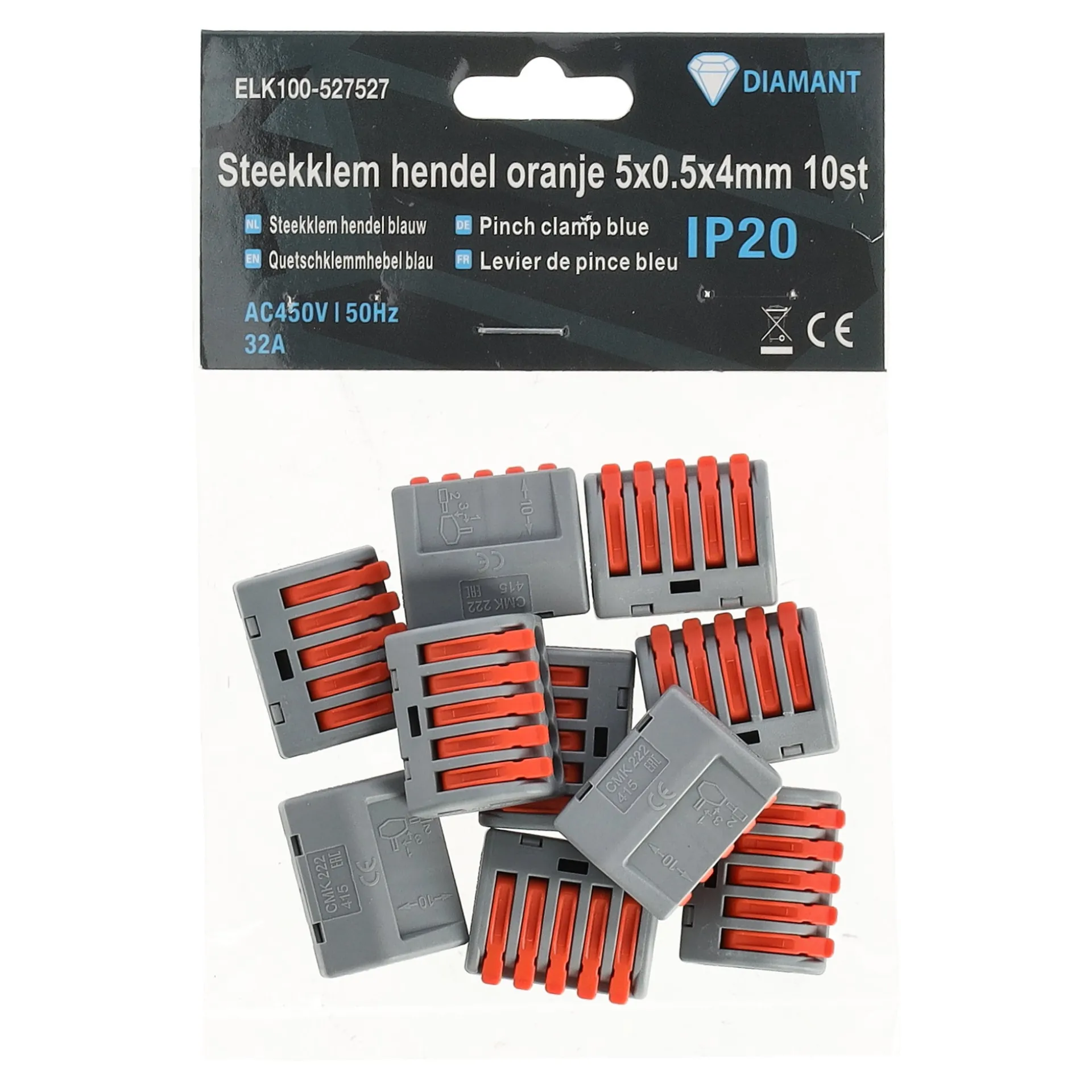 Deze steekklemmen van Diamant met oranje hendel zijn geschikt voor het snel en betrouwbaar verbinden van vijf elektrische draden van 0,5 tot 4 mm². Dankzij de hendelverbinding zijn de draden eenvoudig vast en los te maken zonder gereedschap. Geschikt voor spanning tot 450 V en stroom tot 32 A. Alleen voor binnentoepassing (IP20).