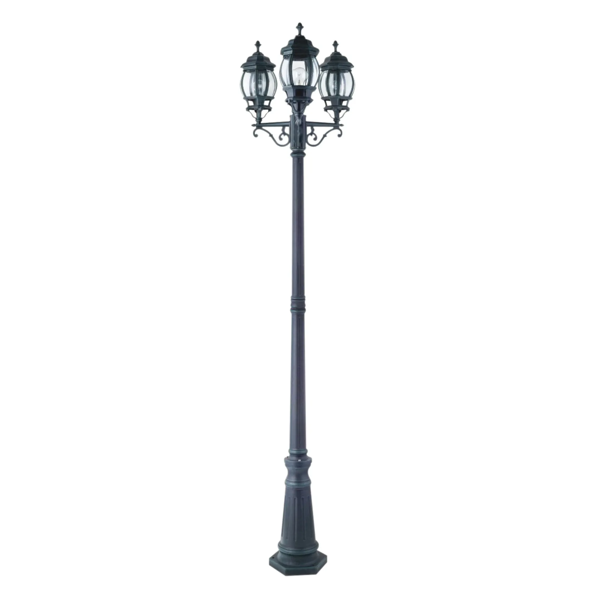 Tuinpaallamp met drie lampen, ideaal voor het verlichten van buitenruimtes met een combinatie van stijl en functionaliteit. Hoogte: 230 cm.