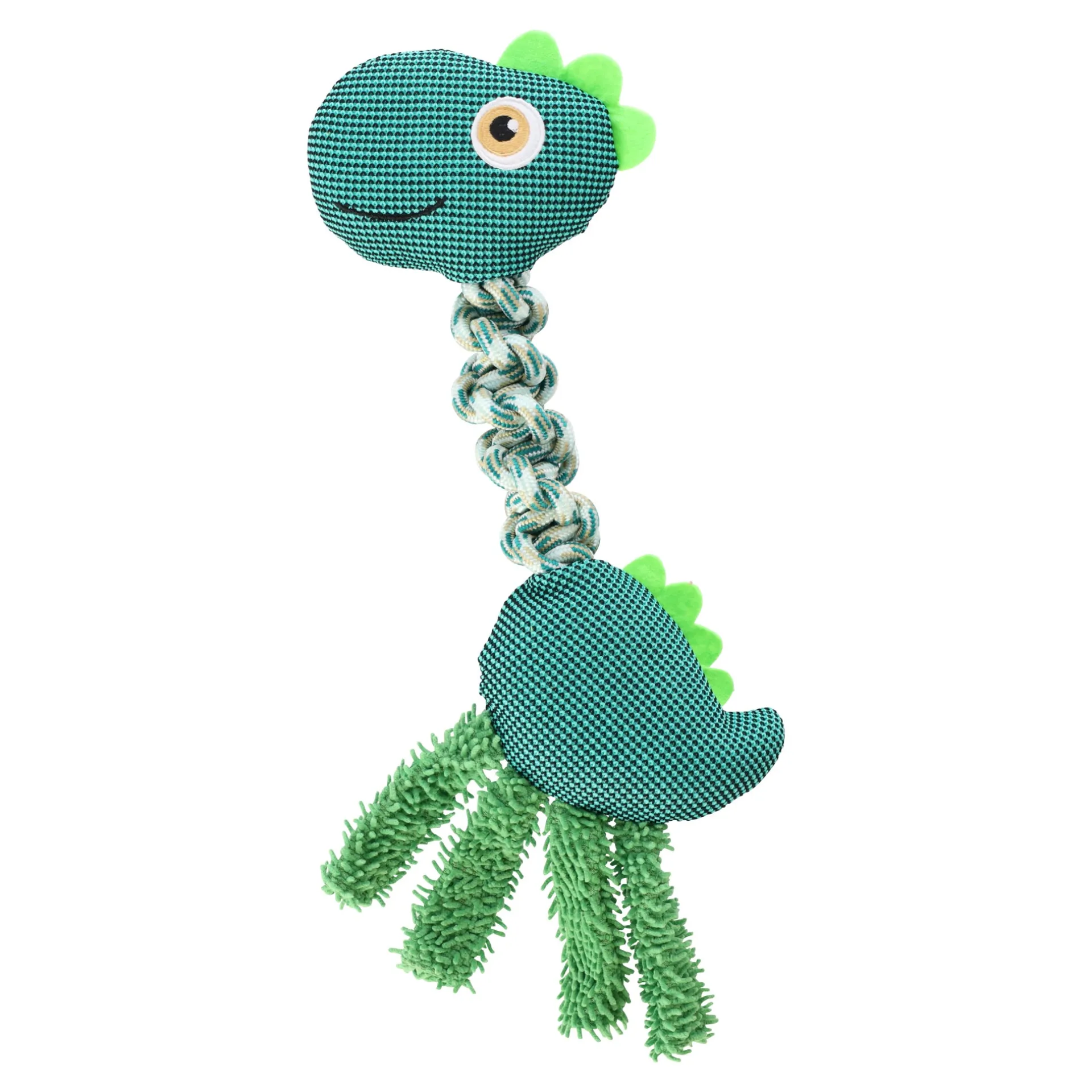 Het is een interactief en leuk speeltje, speciaal ontworpen voor honden die van trekspelletjes en knuffelen houden. Dit speeltje combineert een sterk gevlochten touw met een schattige pluchen dinosaurus, wat zorgt voor een mix van duurzaamheid en zachtheid. Het touw is ideaal voor trekspelletjes, biedt een stevige grip voor zowel hond als eigenaar, en bevordert actief spel.