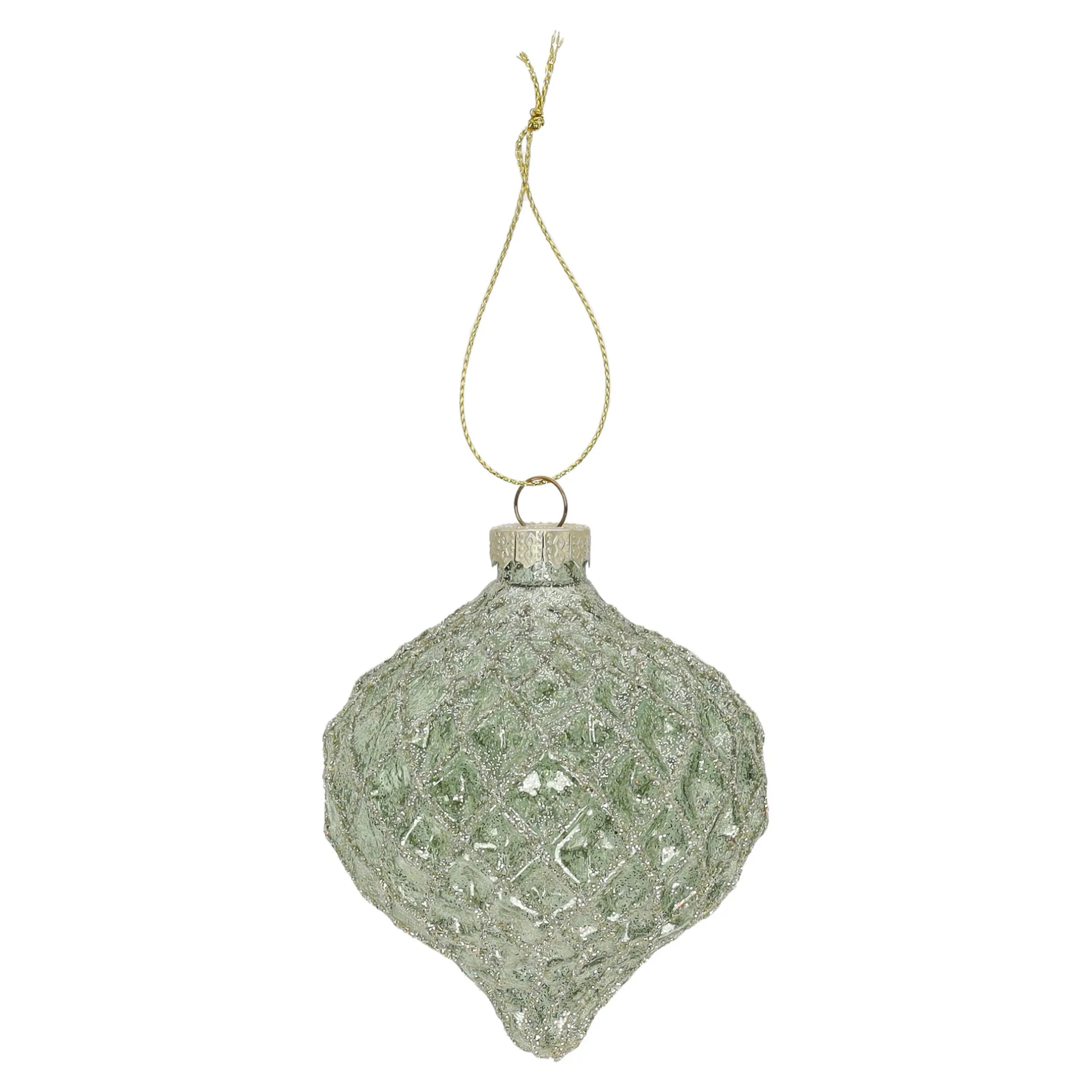 Glazen kerstbal met reliëf en glitterafwerking, mooi als opvallende hanger in de kerstboom.