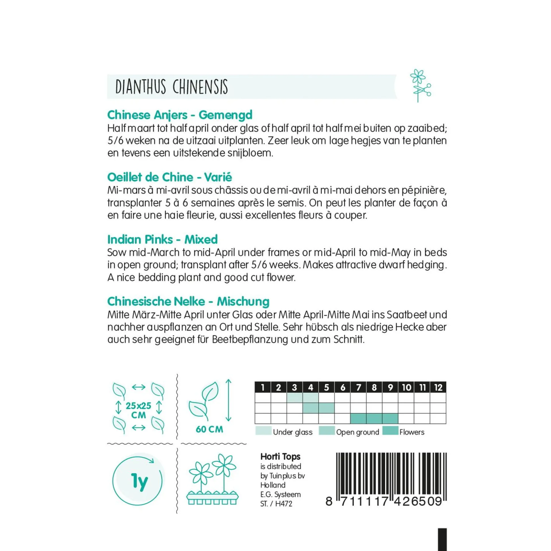 De Dianthus Chinese Mix is een dubbelbloemige Chinese anjer met een rijke mix van kleuren. Deze compacte plant bloeit langdurig en is perfect voor borders, perken en bloembakken. De bloemen zorgen voor een vrolijke en sierlijke uitstraling in de tuin.