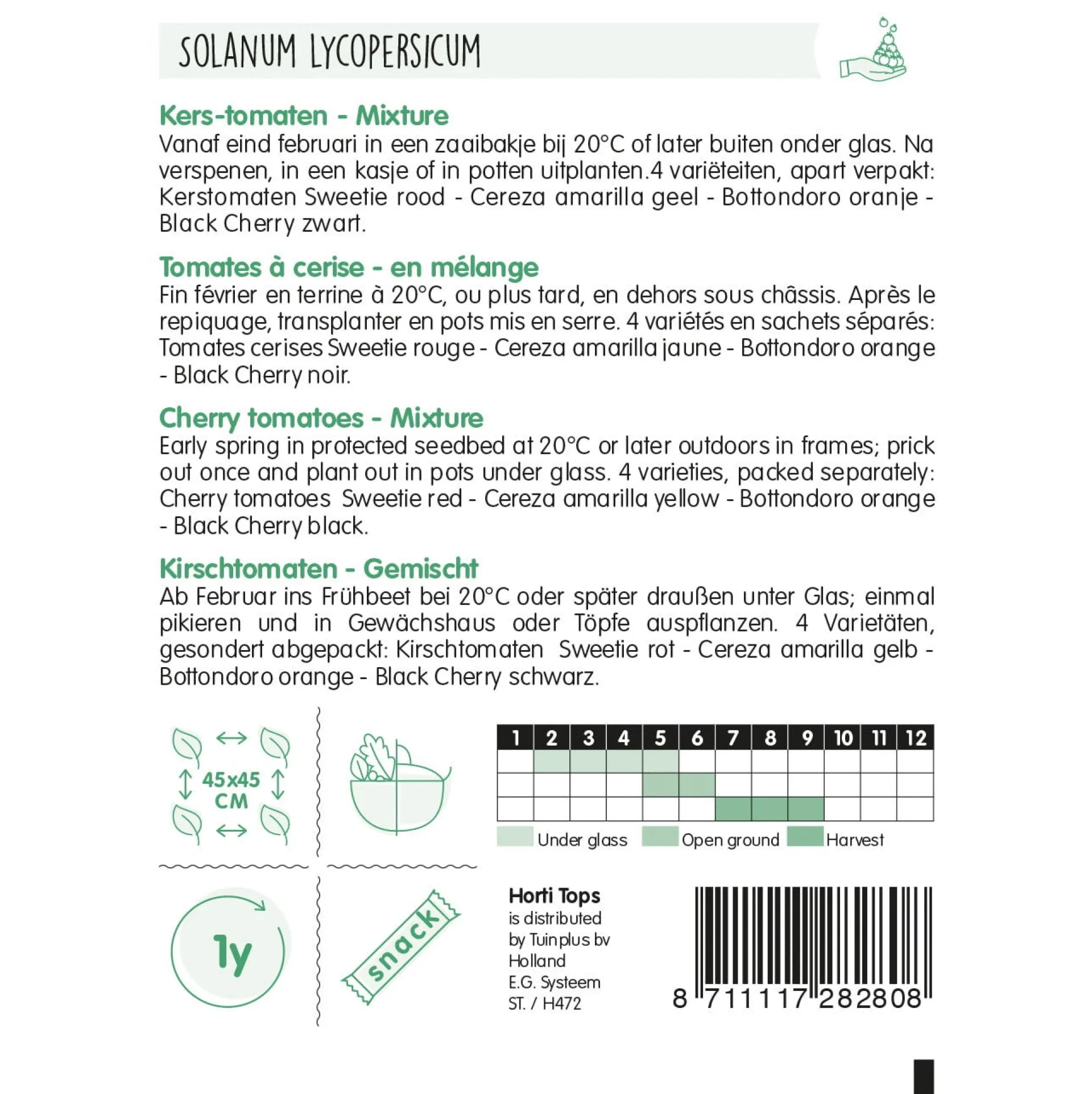 Dit zaad is een mix van 4 apart verpakte kerstomaten, die erg smaakvol zijn. Rood (Sweetie), geel (Cereza amarilla), oranje (Bottondoro) en donkerrood (Black Cherry). Deze kerstomaten zijn zeer geschikt als garnering van gerechten of in salades, of als snack.