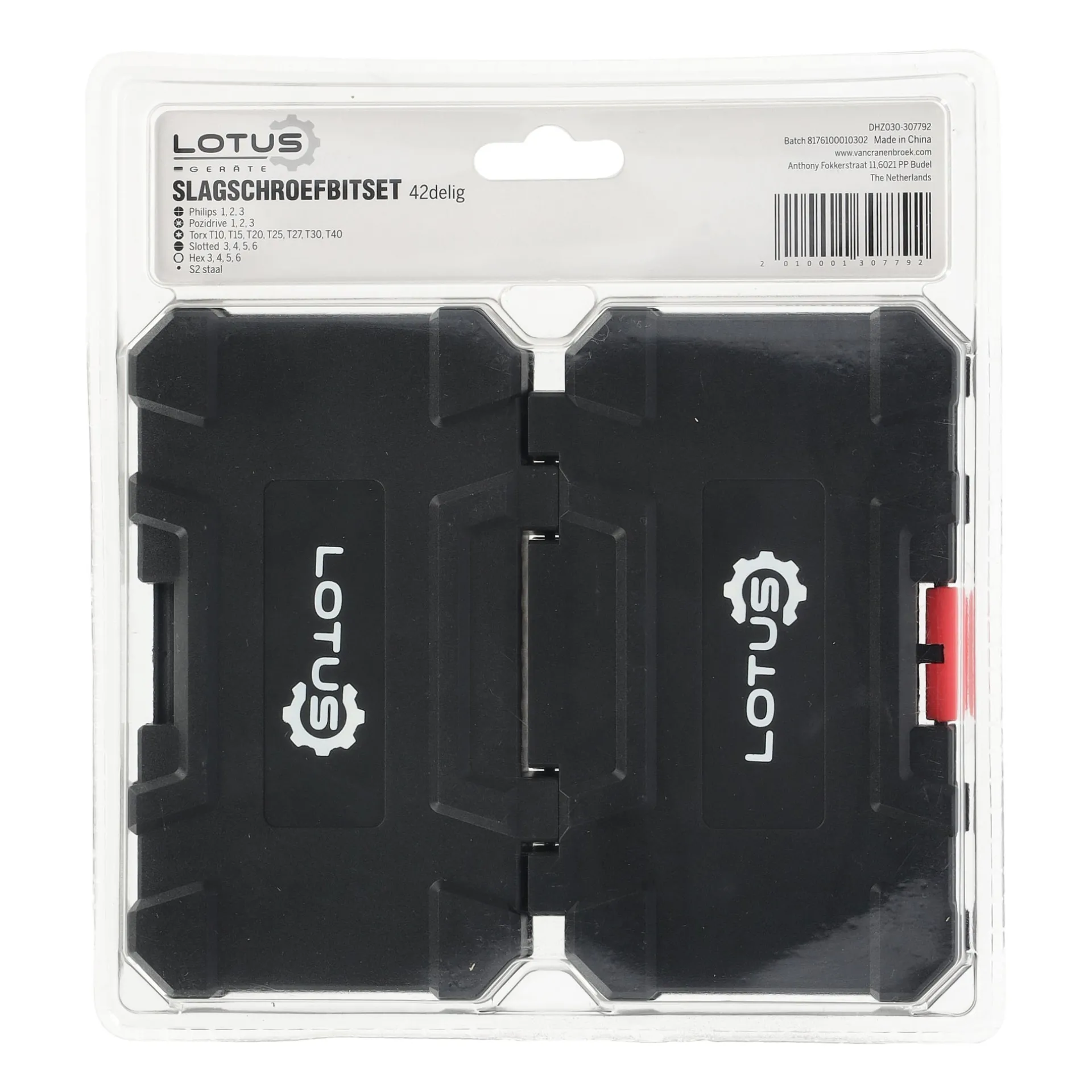 Deze Lotus Geräte slagschroefbitset 42-delig is samengesteld voor uiteenlopende schroefklussen met een slagschroevendraaier of schroefmachine. De set bevat bits in verschillende gangbare profielen en maten, waardoor hij breed inzetbaar is voor montage- en onderhoudswerk. Alle bits zijn gemaakt van S2-staal en overzichtelijk opgeborgen in een stevige kunststof cassette.