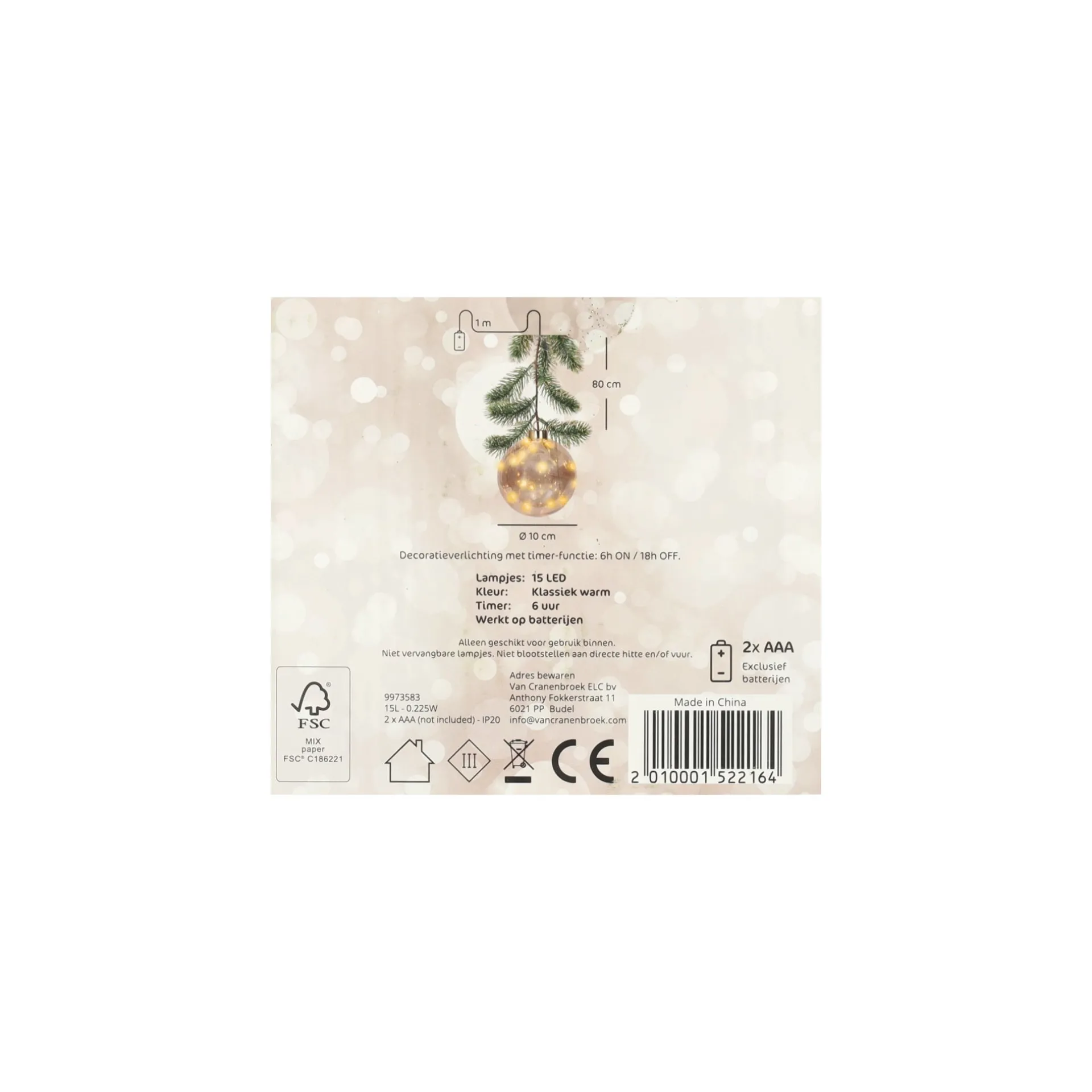 Decoratieve kerstbal met dennentak van kunststof. Voorzien van 15 klassiek-warmwitte LED-lampjes met een ingebouwde timer van zes uur. De transparante goudkleurige bal heeft een diameter van tien centimeter.Je kunt hem ophangen aan bijvoorbeeld een wandhaak, deurknop, kastgreep, raamkozijn of een andere plek in huis waar je een warm lichtaccent wilt creƫren.