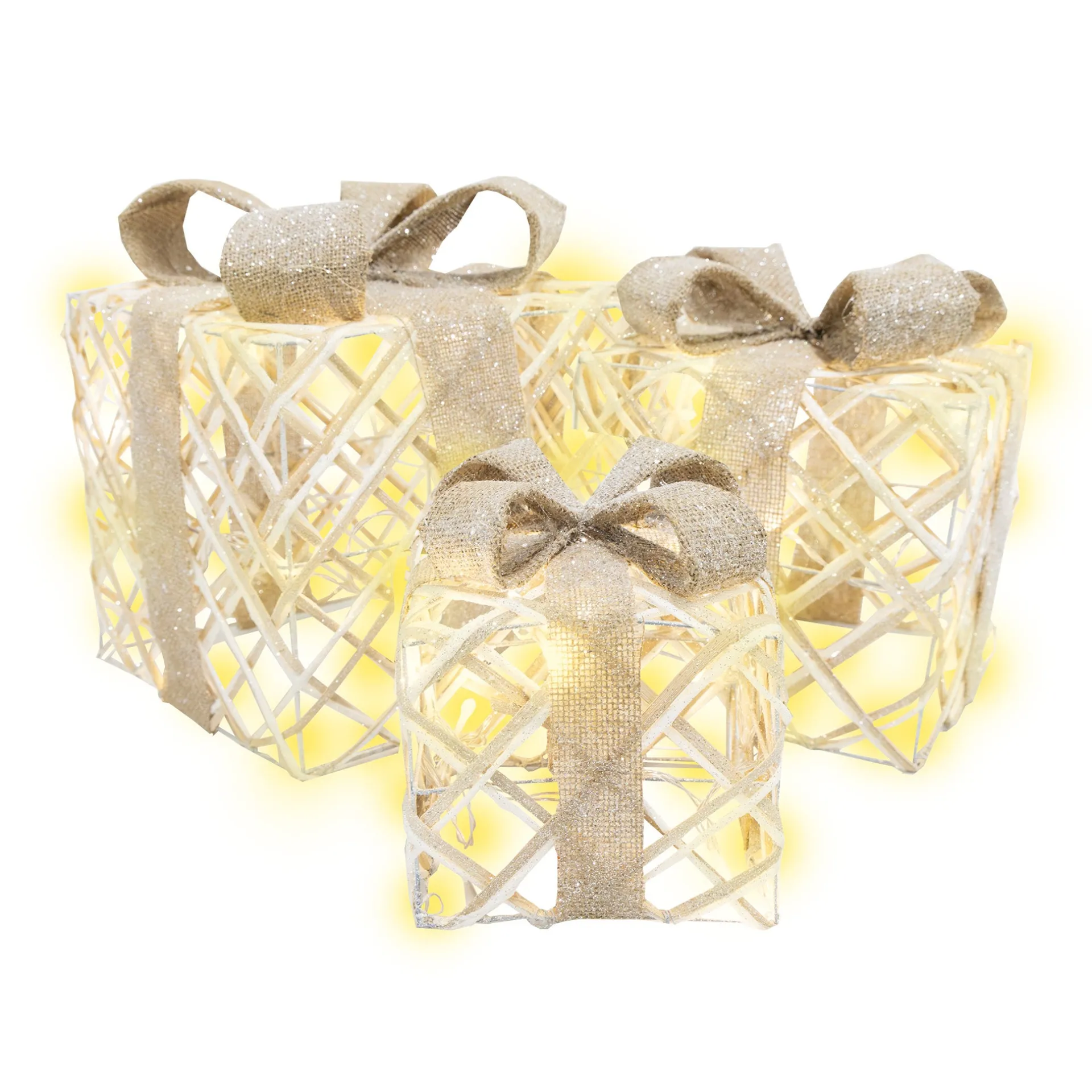Set van drie decoratieve cadeautjes met ingebouwde warme LED-verlichting. Uitgevoerd in een open, geweven structuur met taupekleurige, glinsterende linten. Perfect om bij de kerstboom neer te zetten of andere plekken in de woonkamer op te leuken.