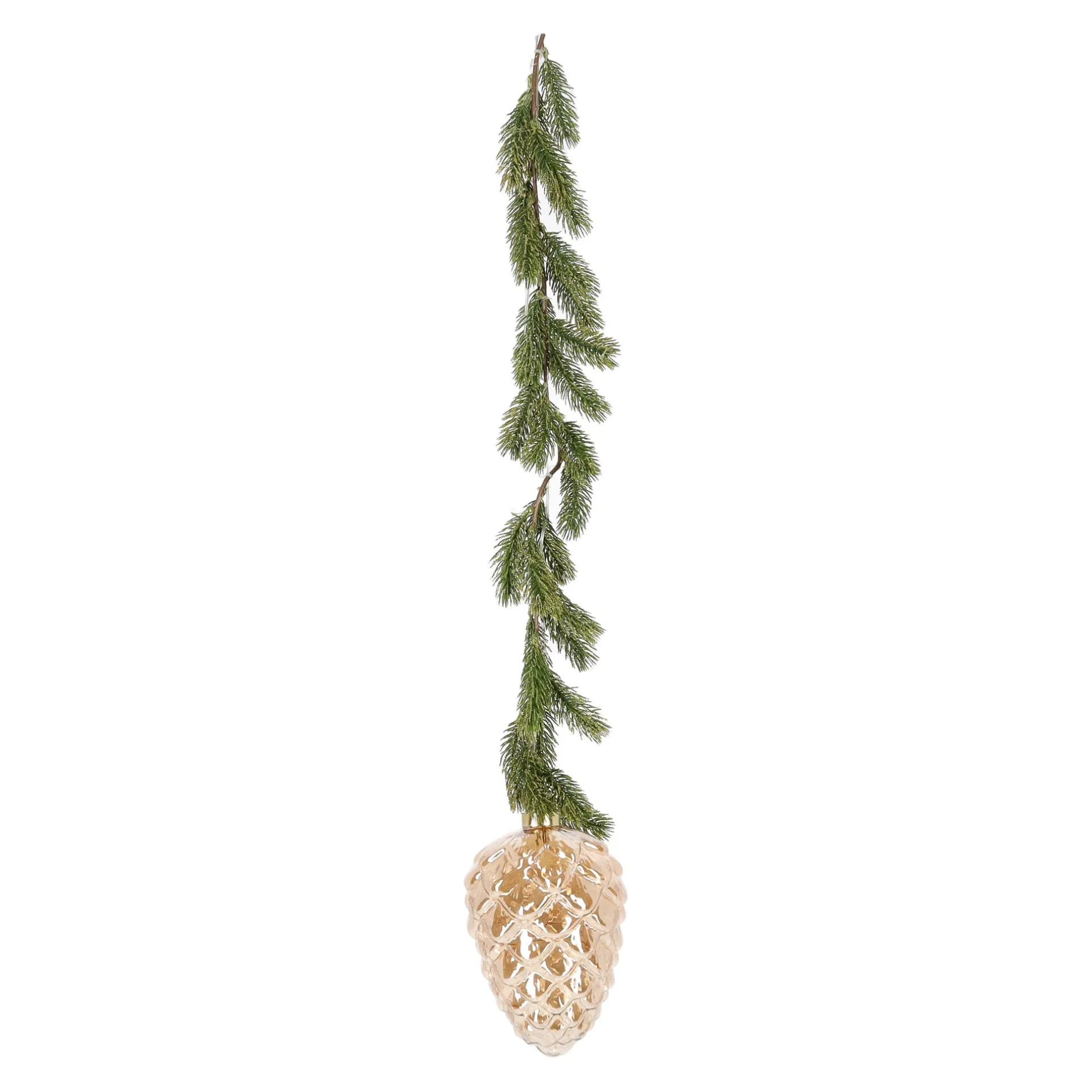 Decoratieve dennenappel met dennentak van kunststof. Voorzien van 15 klassiek-warmwitte LED-lampjes met een ingebouwde timer van zes uur. De transparante goudkleurige dennenappel heeft een lengte van 21 centimeter.Je kunt hem ophangen aan bijvoorbeeld een wandhaak, deurknop, kastgreep, raamkozijn of een andere plek in huis waar je een warm lichtaccent wilt creƫren.