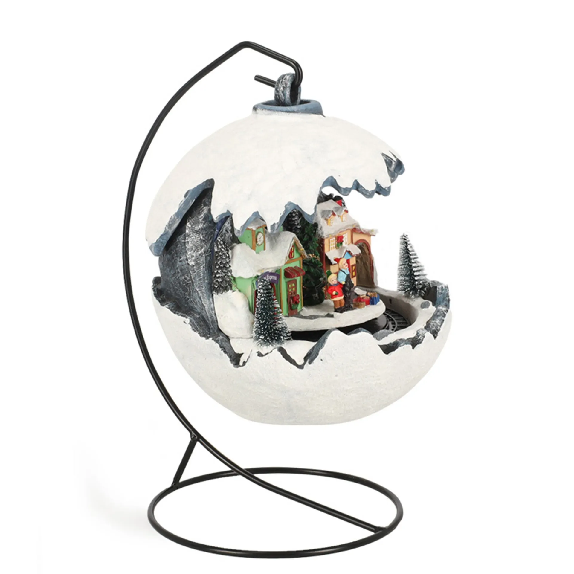 Kerstdorp met trein in een sneeuwbal op voet, voorzien van verlichting en winterse details.