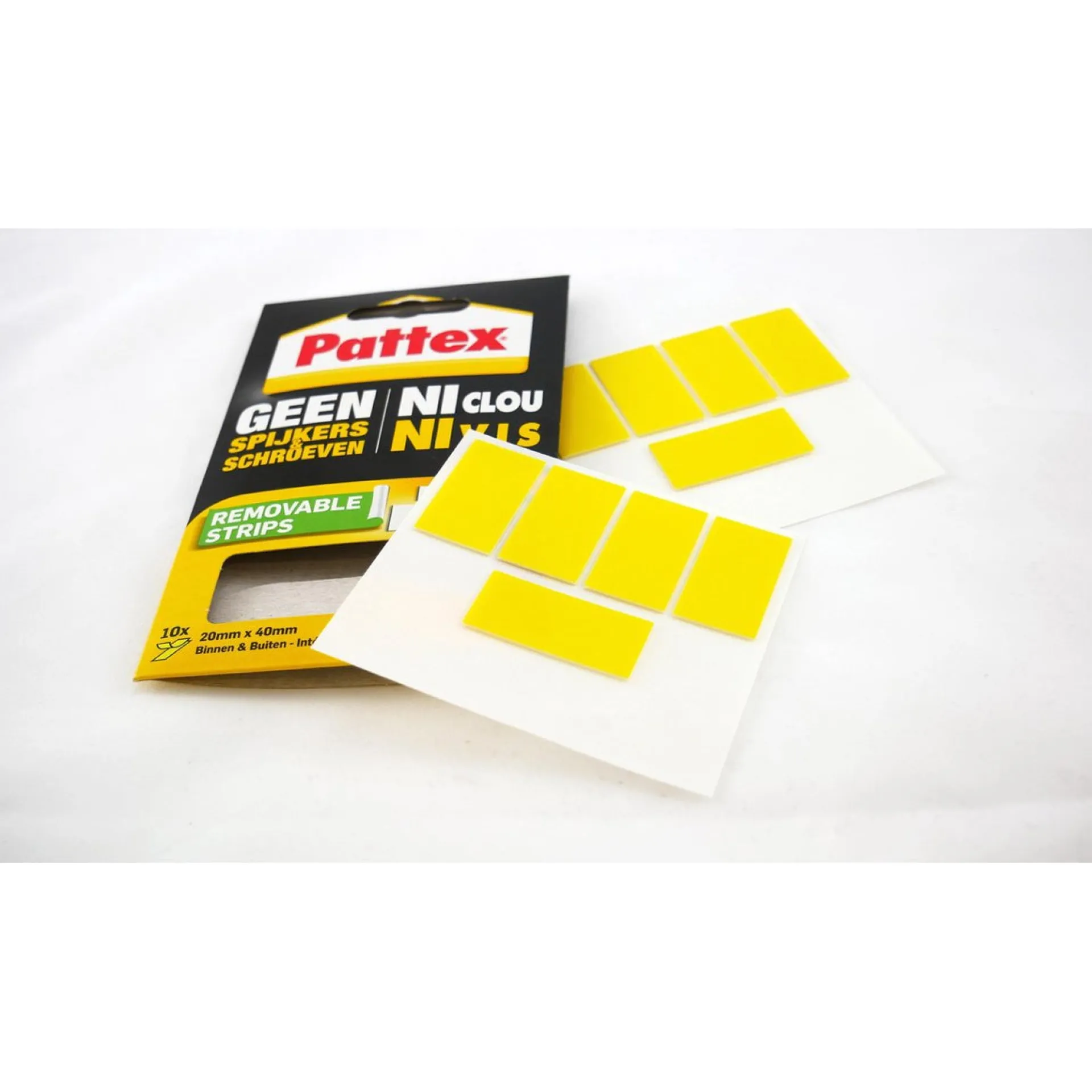 Pattex Montagestrips Geen Spijkers zijn dubbelzijdige strips voor stevig bevestigen zonder boren. Geschikt voor binnen/buiten, dragen tot 2,75 kg per strip.