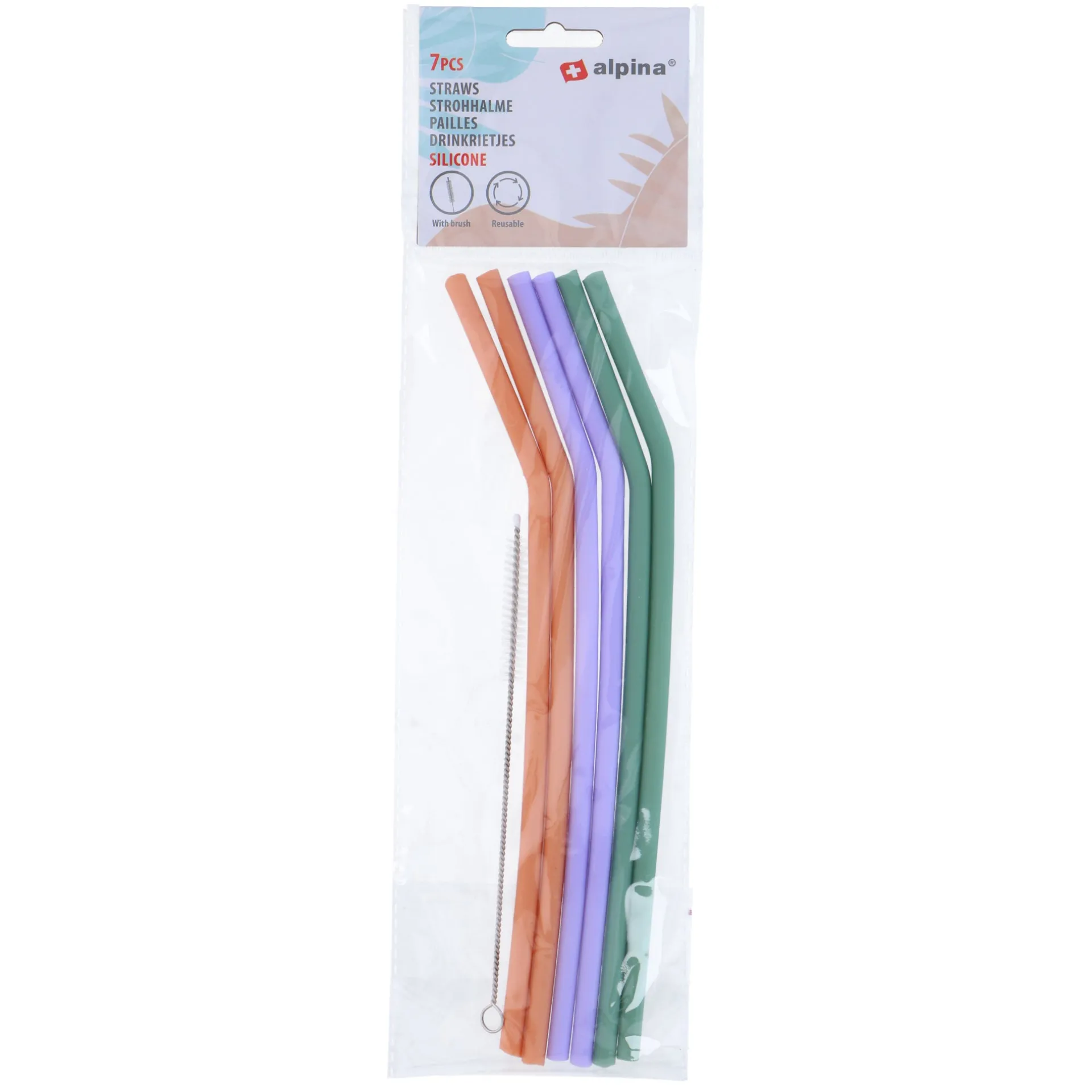 Siliconen rietjes + borstel 7 stuks Alpina – BeschrijvingEen set Alpina siliconen rietjes met borsteltje is een praktische en ecologische oplossing voor mensen die het milieu belangrijk vinden en waarde hechten aan comfort.