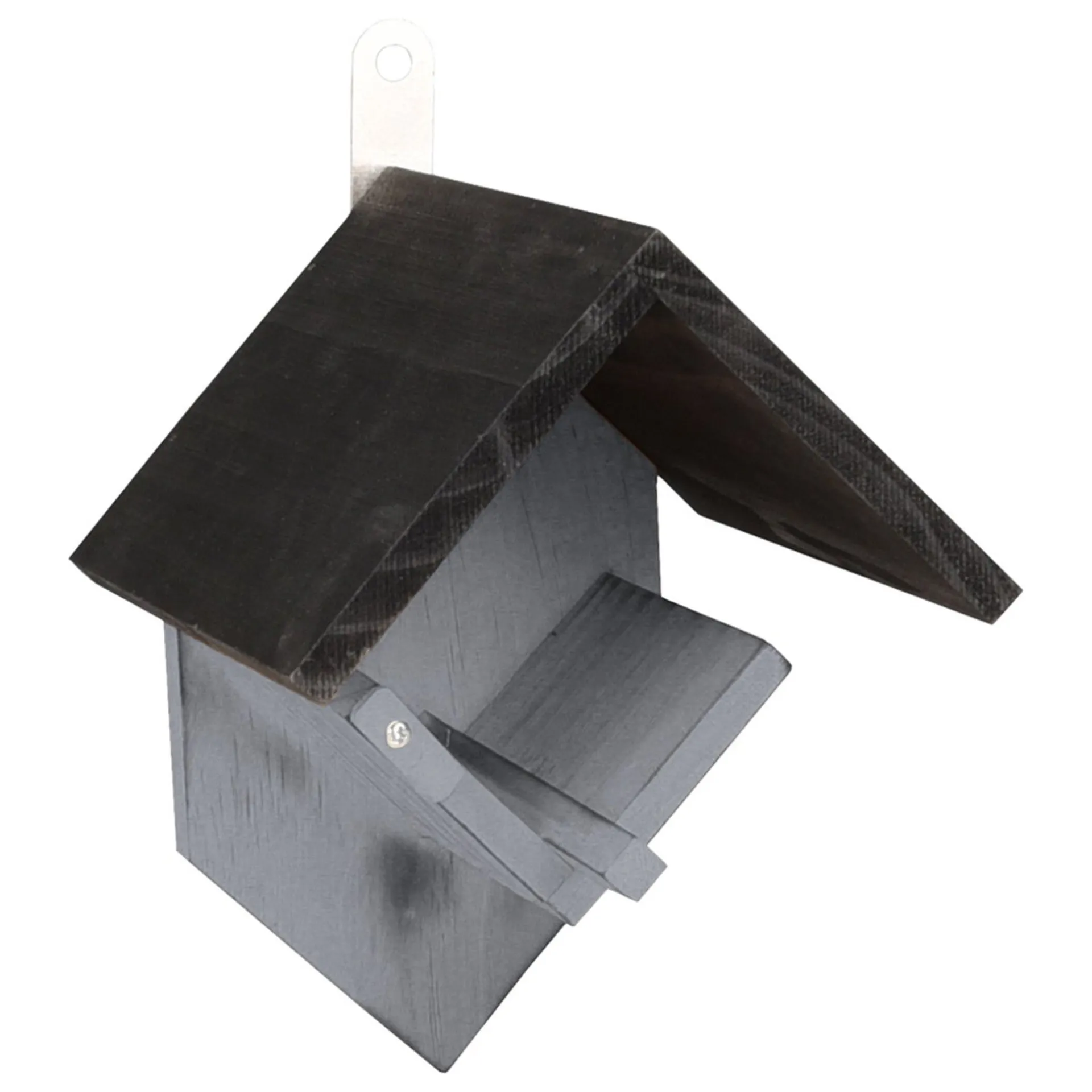 Grijs houten pindakaashouder met zwart dak. Eenvoudig op te hangen en geschikt voor één pot vogelpindakaas.