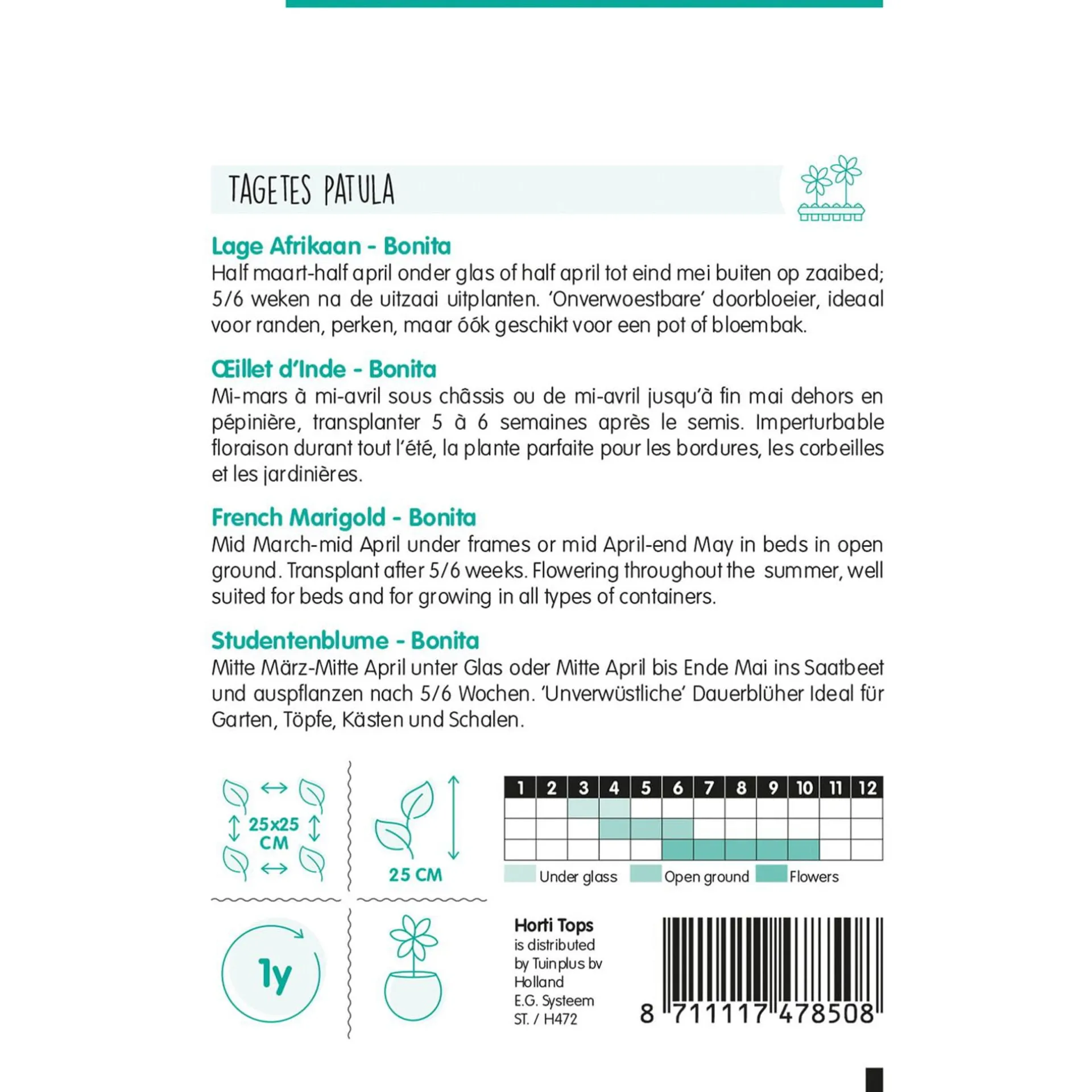 Een heldere en compacte eenjarige plant, perfect voor bloembedden en borders. Bloemen in verschillende tinten zorgen voor een weelderige en decoratieve uitstraling. Gemakkelijk te onderhouden en bestand tegen ongunstige weersomstandigheden. Tagetes-planten (Afrikaantjes) staan erom bekend dat zij schadelijke insecten op afstand houden, terwijl ze nuttige bijen en vlinders aantrekken. Een uitstekende keuze voor een kleurrijke tuin.