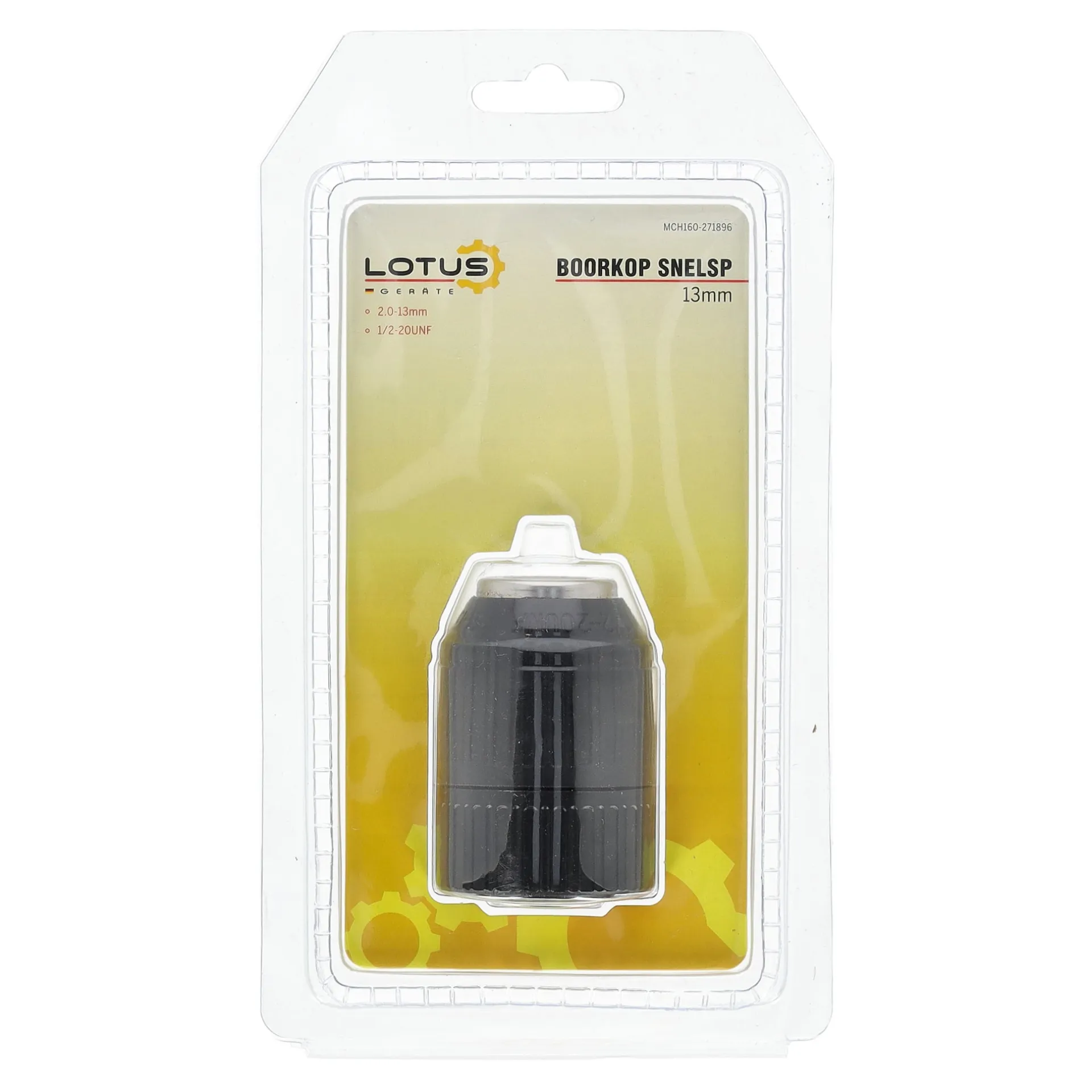 Deze Lotus snelspanboorkop is geschikt voor boren met een diameter van 2 tot 13 mm. Dankzij de snelspanfunctie wissel je boren eenvoudig zonder sleutel. De boorkop heeft een 1/2-20 UNF aansluiting en is bedoeld voor gebruik op boormachines met deze schroefdraad. Een praktische vervanging of upgrade voor dagelijks boorwerk.