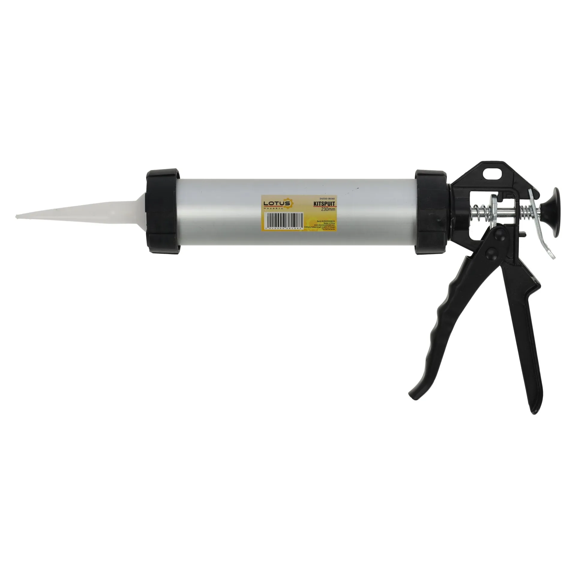 Deze kitspuit van Lotus is bedoeld voor het eenvoudig aanbrengen van kit bij allerlei afdichtingsklussen. De spuit heeft een stevige aluminium cilinder van 230 mm met zwarte handgreep en trekker, waardoor je de kit gecontroleerd kunt doseren. Voorzijde en achterzijde zijn afsluitbaar en de meegeleverde spuitmond zorgt ervoor dat je de kit precies daar aanbrengt waar dat nodig is.