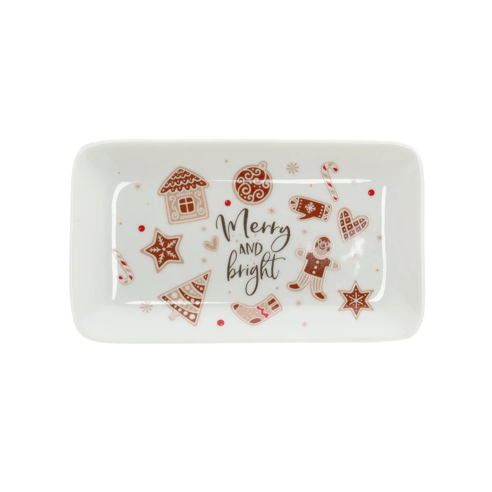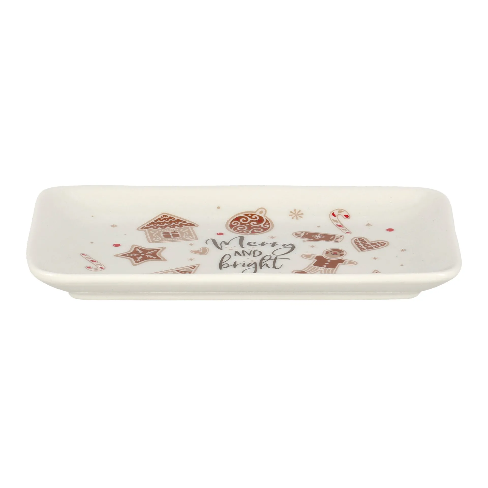 Dit rechthoekige bord van 18 x 10 cm is versierd met gezellige kerstmotieven zoals peperkoekfiguren, kerstboompjes en zuurstokken. In het midden staat de tekst “Merry and bright”. Ideaal voor koekjes of snacks tijdens de feestdagen. Gemaakt van keramiek en eenvoudig schoon te maken.