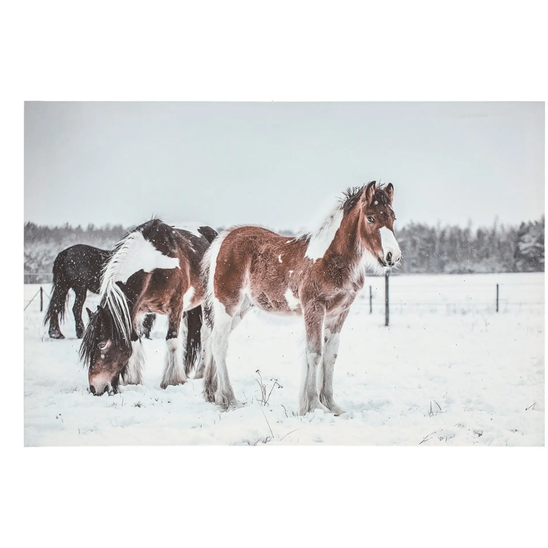 Schilderij met LED-verlichting en afbeelding van paarden in een besneeuwd winterlandschap, formaat 60 x 40 cm. Zorgt voor een sfeervol lichtaccent aan de muur.