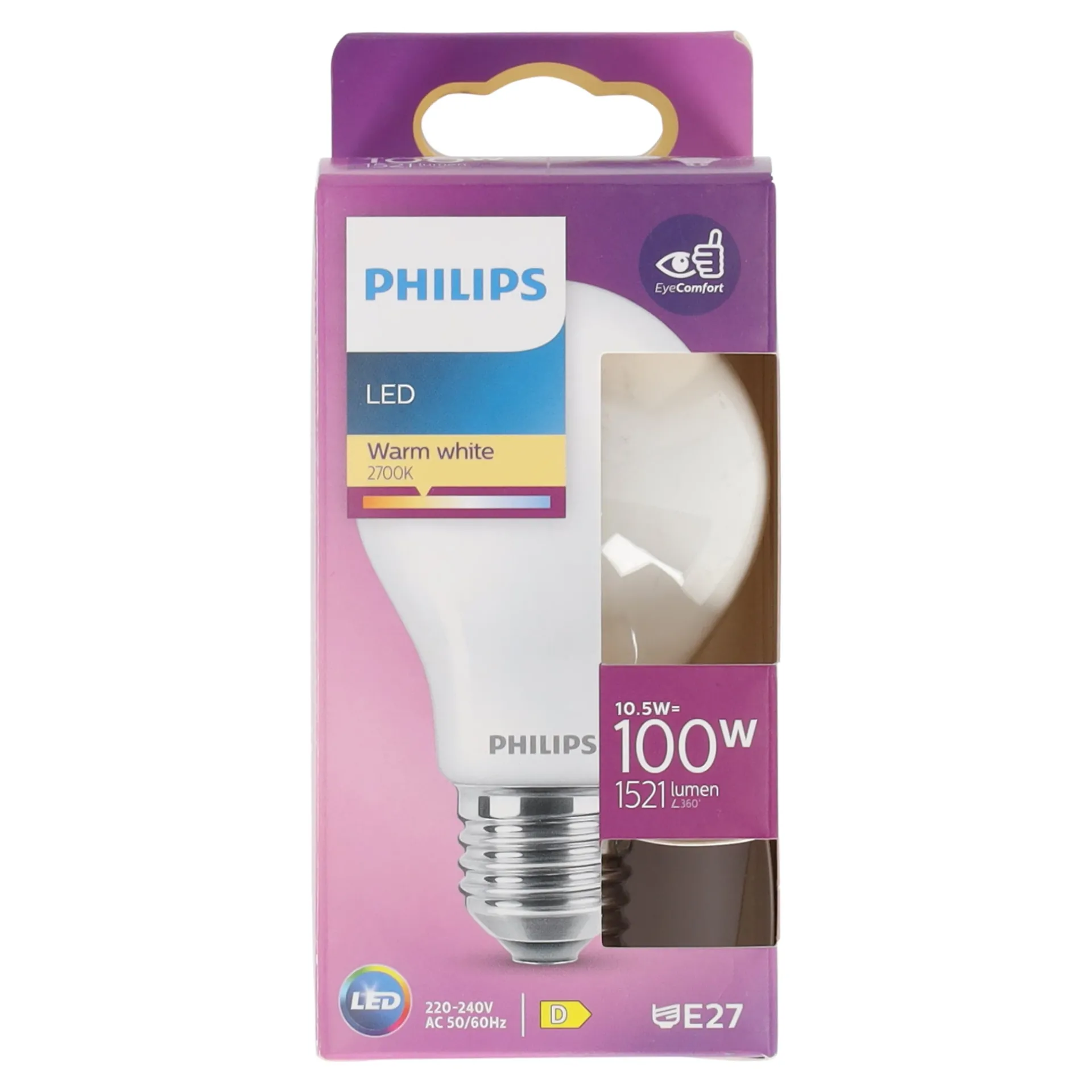 Philips LED-lamp met een E27-fitting, een lichtopbrengst van 1521 lumen, en een verbruik van 11 watt. Deze lamp biedt warmwit licht (2700K) en is energiezuinig met een lange levensduur.