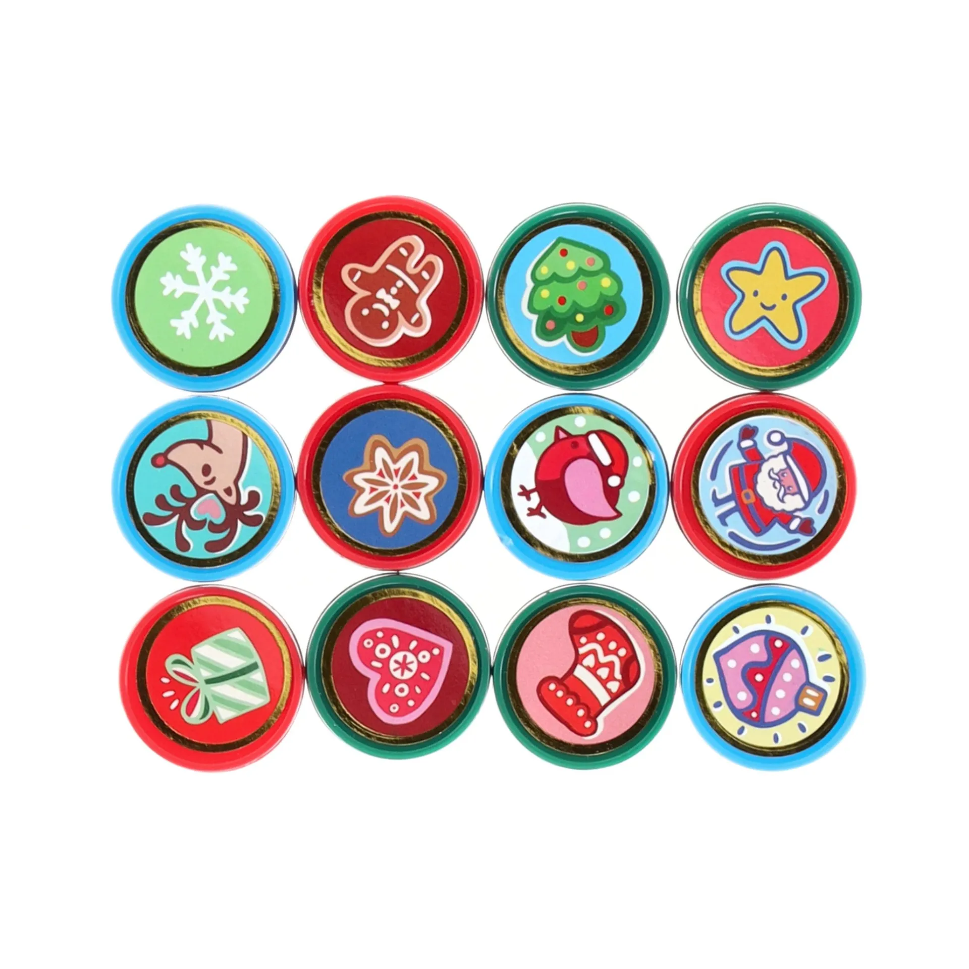 Set van 12 kerststempels in verschillende vrolijke designs zoals sneeuwvlok, rendier en kerstboom. Gemaakt van kunststof met ingebouwde inkt, leuk voor het versieren van kaarten, cadeaupapier of knutselprojecten.