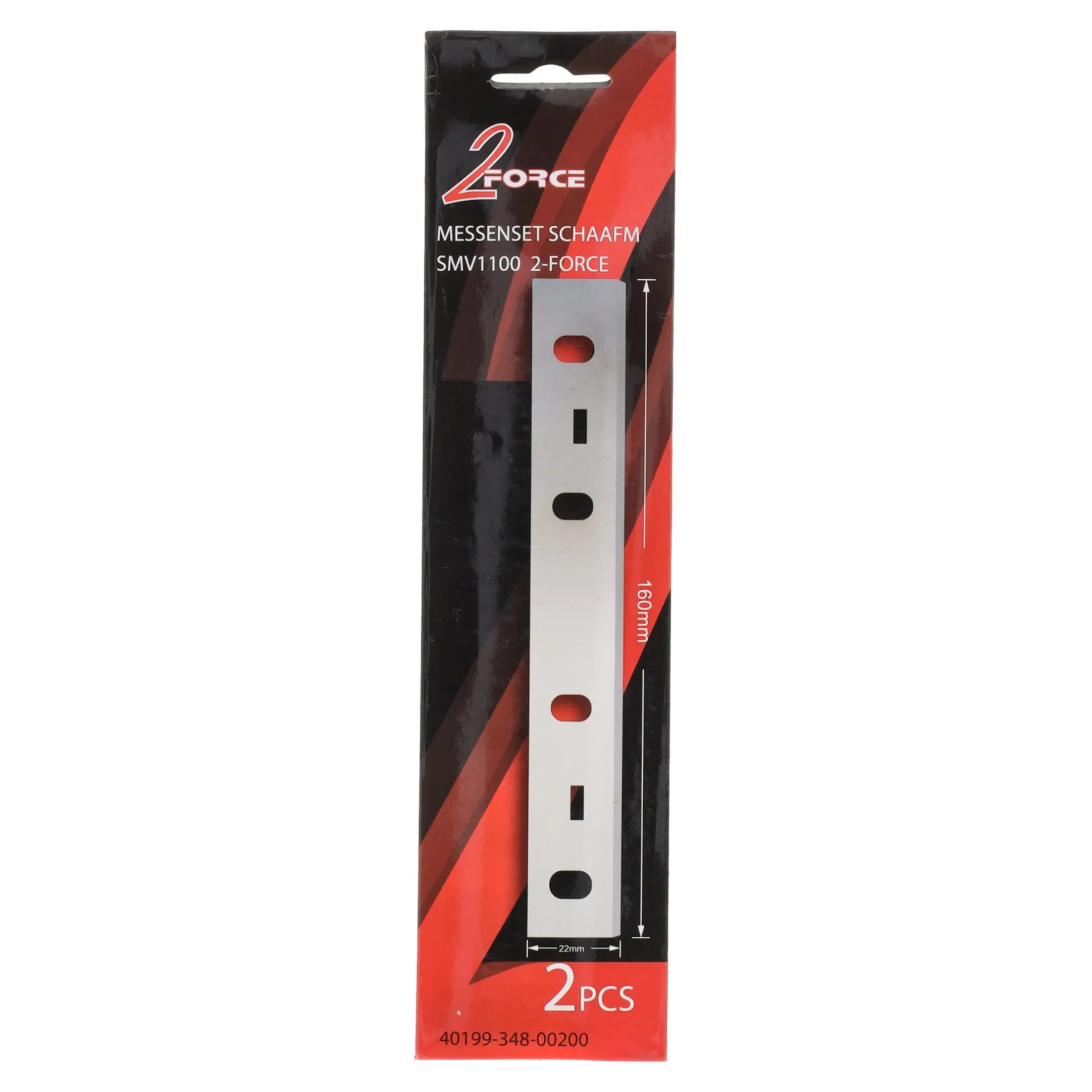 Messenset van 2 stuks, geschikt voor de 2-Force schaafmachine SMV1100. De messen zijn 160 mm lang en zorgen voor een strak en nauwkeurig schaafresultaat bij houtbewerking.