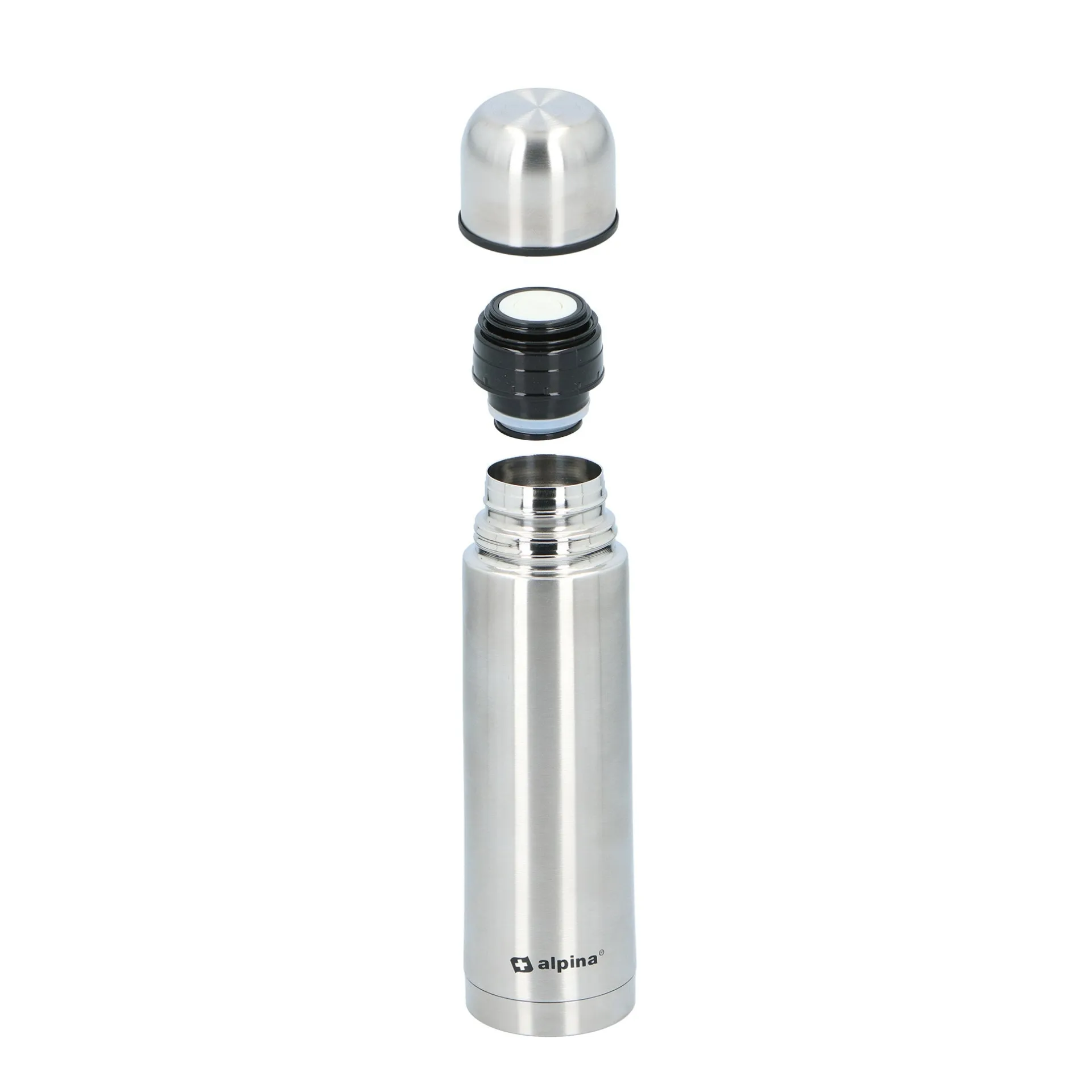 Dubbelwandige roestvrijstalen vacuumfles van Alpina met een inhoud van 480 ml. Houdt dranken langdurig warm of koud. Compact formaat, ideaal voor onderweg, werk of sport.