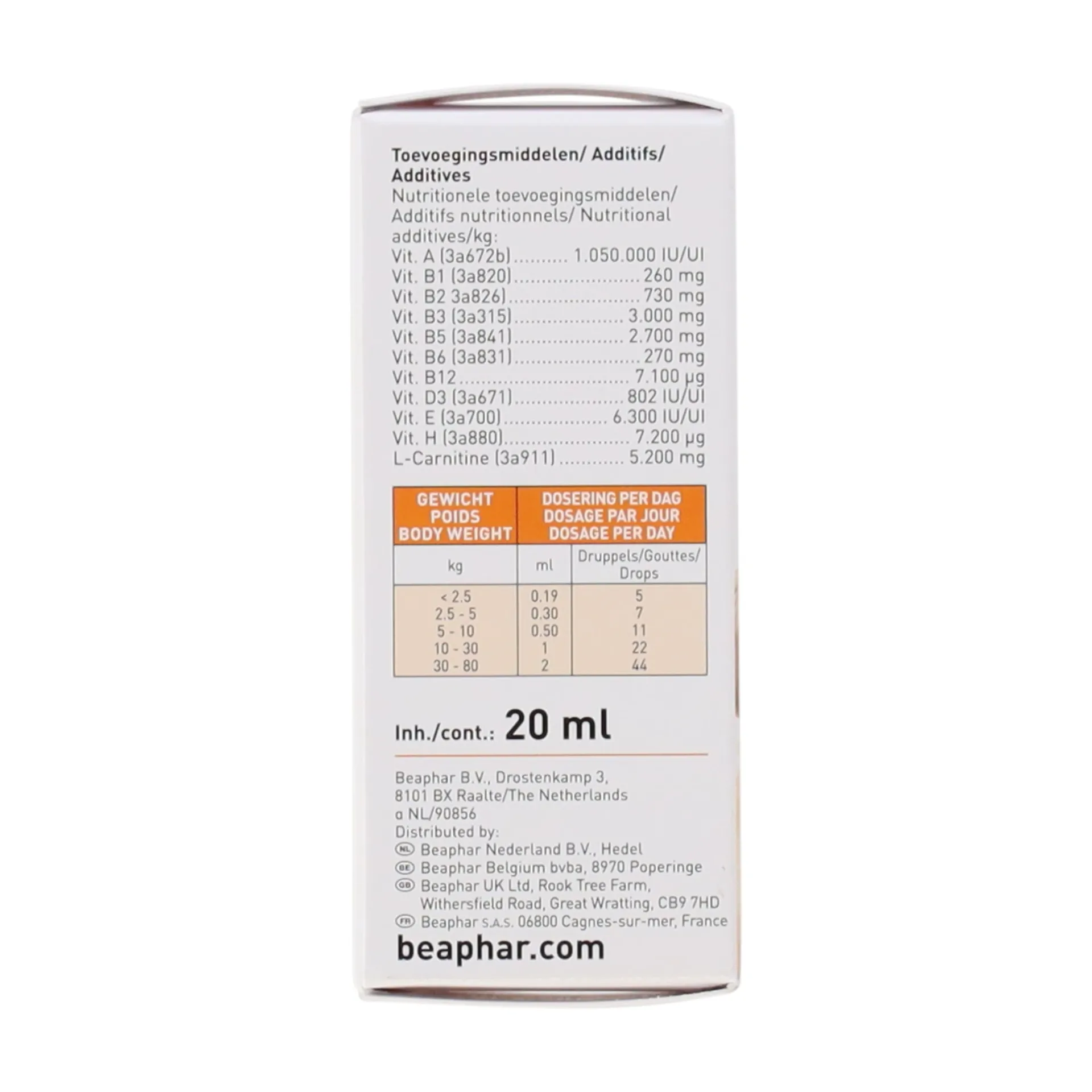 Toevoegingen: Per kg: Vit. A 1050000 IU, Vit. B1 260 mg, Vit. B2 730 mg, Vit. B3 3000 mg, Vit. B5 2500 mg, Vit. B6 270 mg, Vit. B12 7100 μg, Vit. D3 (E671) 792 IU, Vit. E 6300 IU, L-Carnitine 5200 mg.