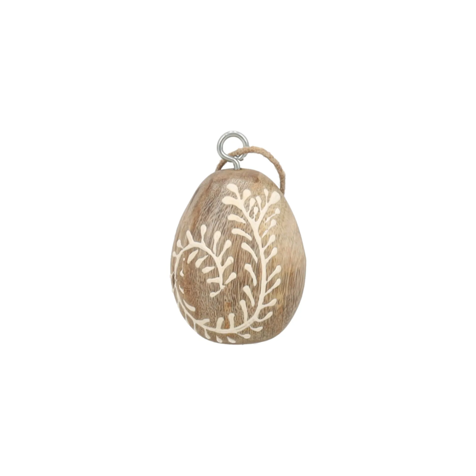 Deze hangdecoratie in eivorm heeft een natuurlijke houtlook met een wit reliëfpatroon. Het juten koord maakt het eenvoudig om het object op te hangen aan een tak, haak of kastknop en zorgt voor een rustig, decoratief accent.
