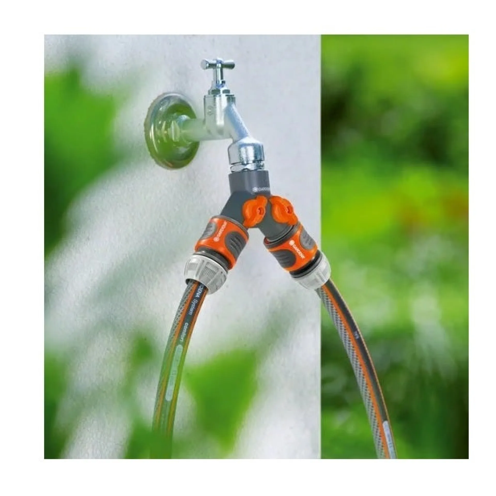 Dit Gardena 2-wegstuk 1/2″ (00936) splits één wateraansluiting in twee afzonderlijke uitgangen. Elke uitgang heeft een eigen regelkraantje, zodat je de watertoevoer per slang kunt openen of sluiten. Handig als je bijvoorbeeld tegelijk een sproeier en een tuinslang wilt aansluiten op dezelfde kraan.