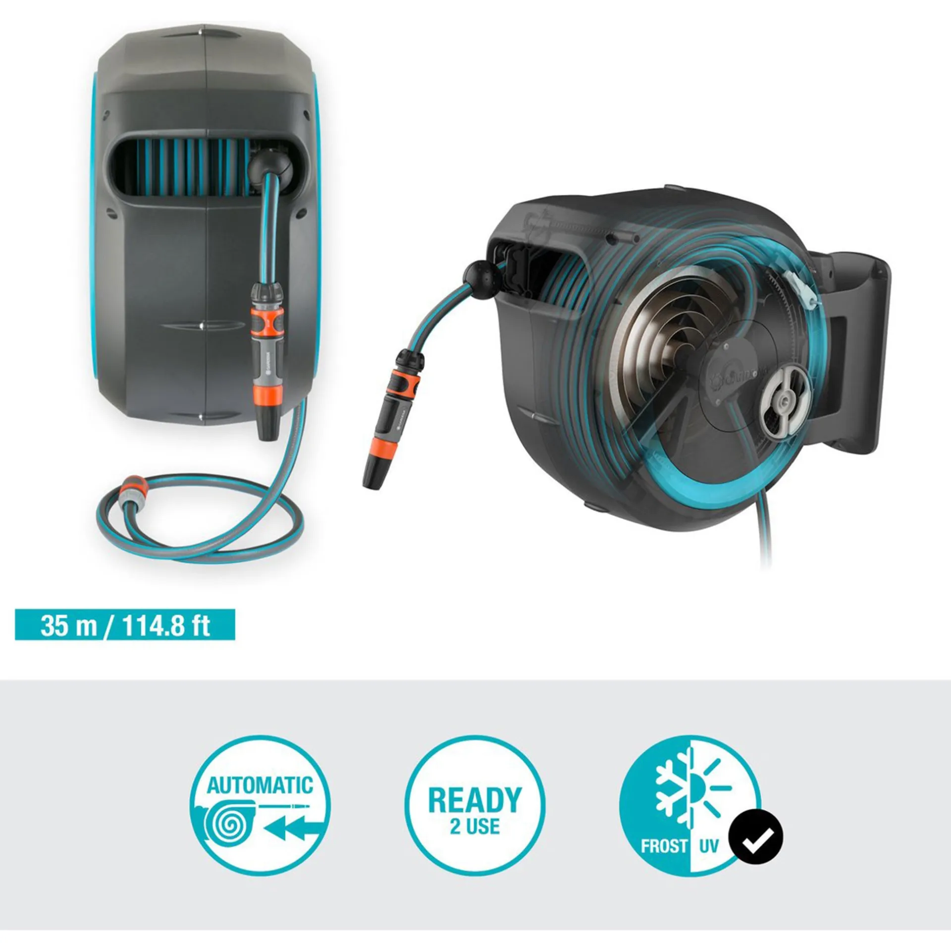 De Gardena Wandslangenbox RollUp XL 35 m maakt tuinbewatering eenvoudig. De slang rolt automatisch op, blijft schoon en raakt niet in de knoop. De 35 meter lange slang kan tot de gewenste lengte worden uitgerold en blijft vast door de vergrendelingspunten. De slangenhouder draait 180 graden met de muurbeugel, zodat hij je bewegingen volgt.
