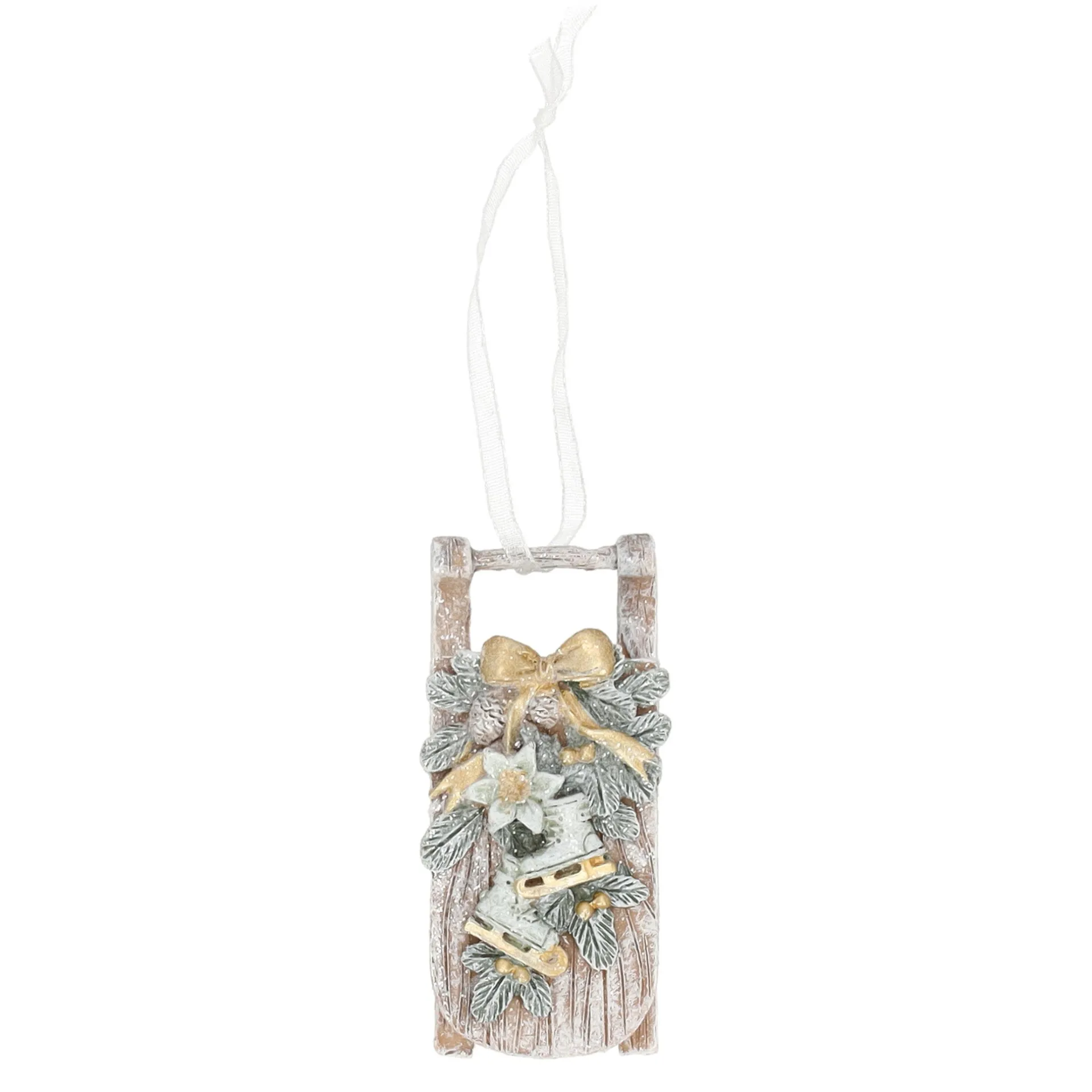 Deze hanger in de vorm van een slee met winterse decoratie brengt een rustieke, klassieke kerstsfeer in de boom. De slee heeft een houtlook met daarop groene takjes, gouden strikjes en kleine schaatsjes als detail. De sneeuwaccenten maken het ornament extra winters. Met het witte lint hang je deze slee eenvoudig tussen de takken.