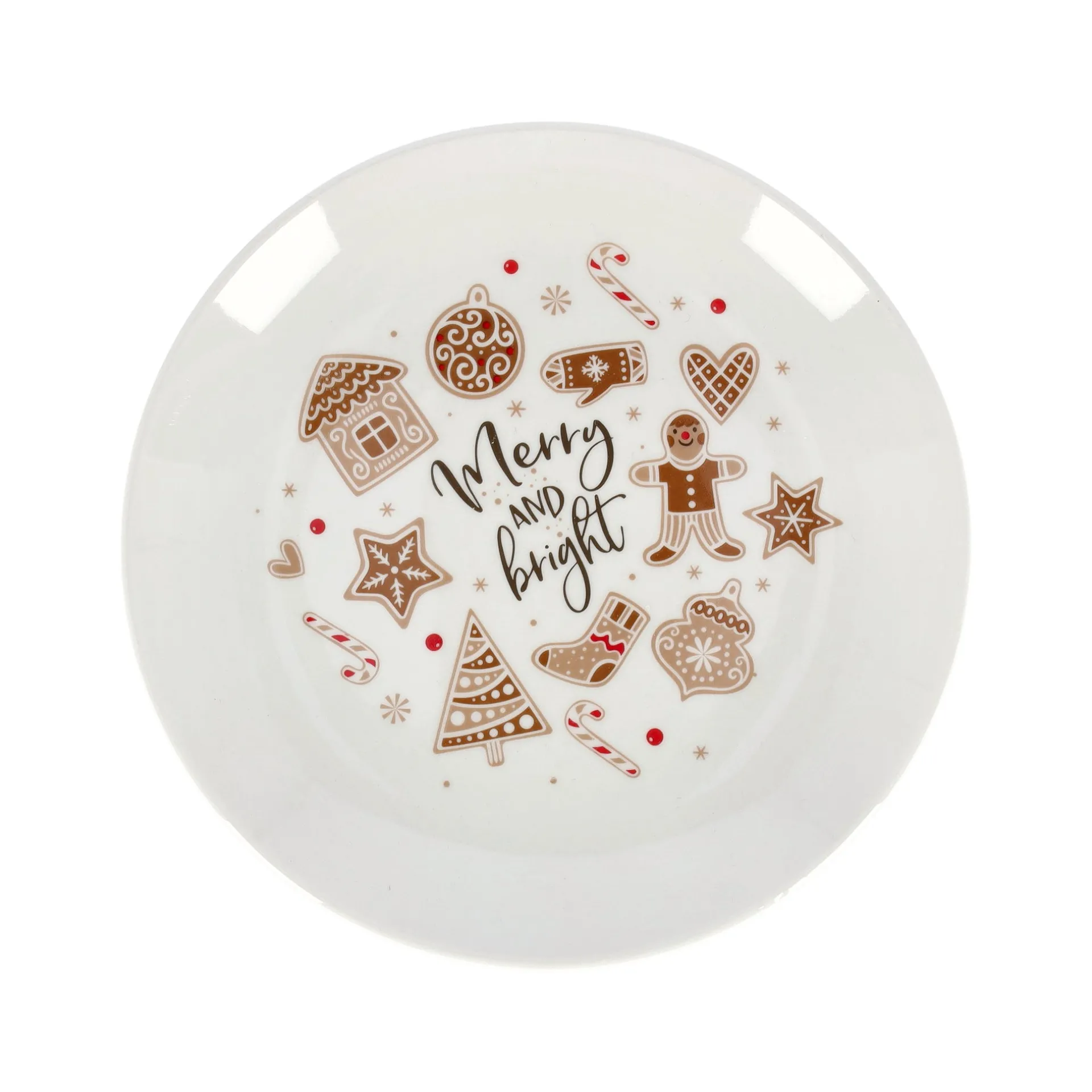 Dit ronde bord van 19 cm is versierd met gezellige kerstmotieven zoals peperkoekfiguren, kerstboompjes en zuurstokken. In het midden staat de tekst “Merry and bright”. Perfect voor gebak of snacks tijdens de feestdagen. Gemaakt van keramiek en eenvoudig schoon te maken.