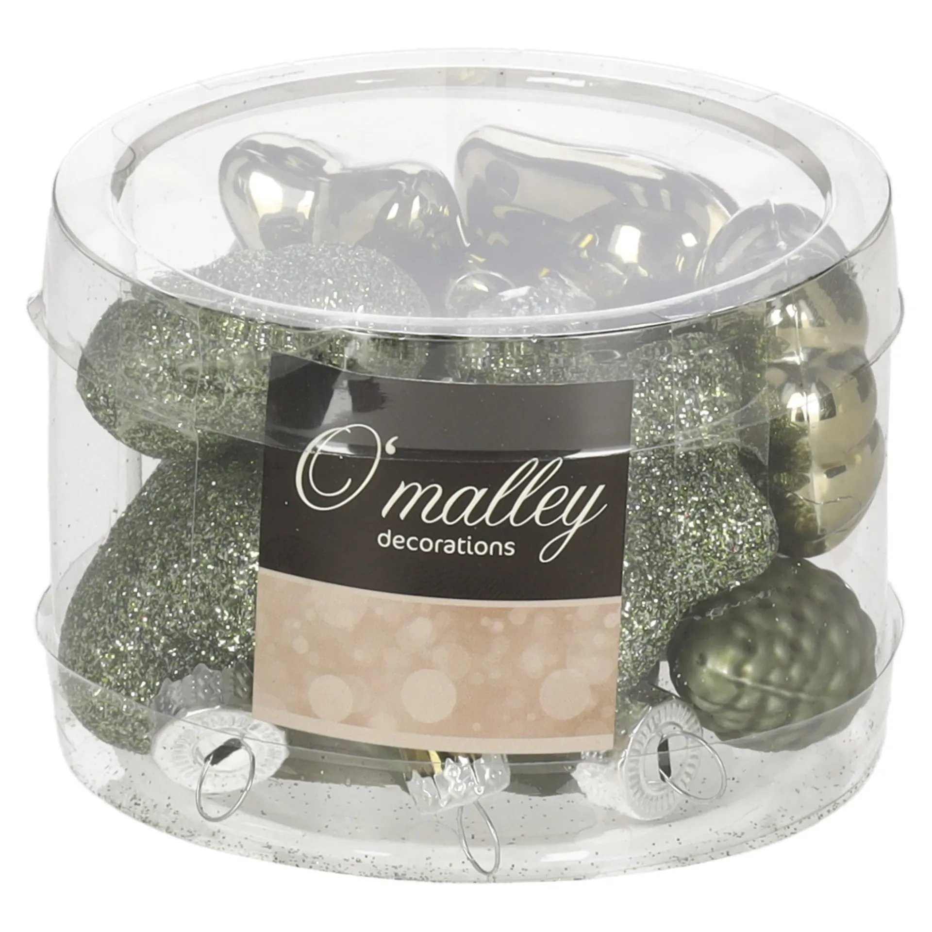 Deze transparante koker bevat 12 kerstornamenten in rosemary-groen, uitgevoerd in verschillende vormen met zowel matte, glanzende als glitterende afwerkingen.