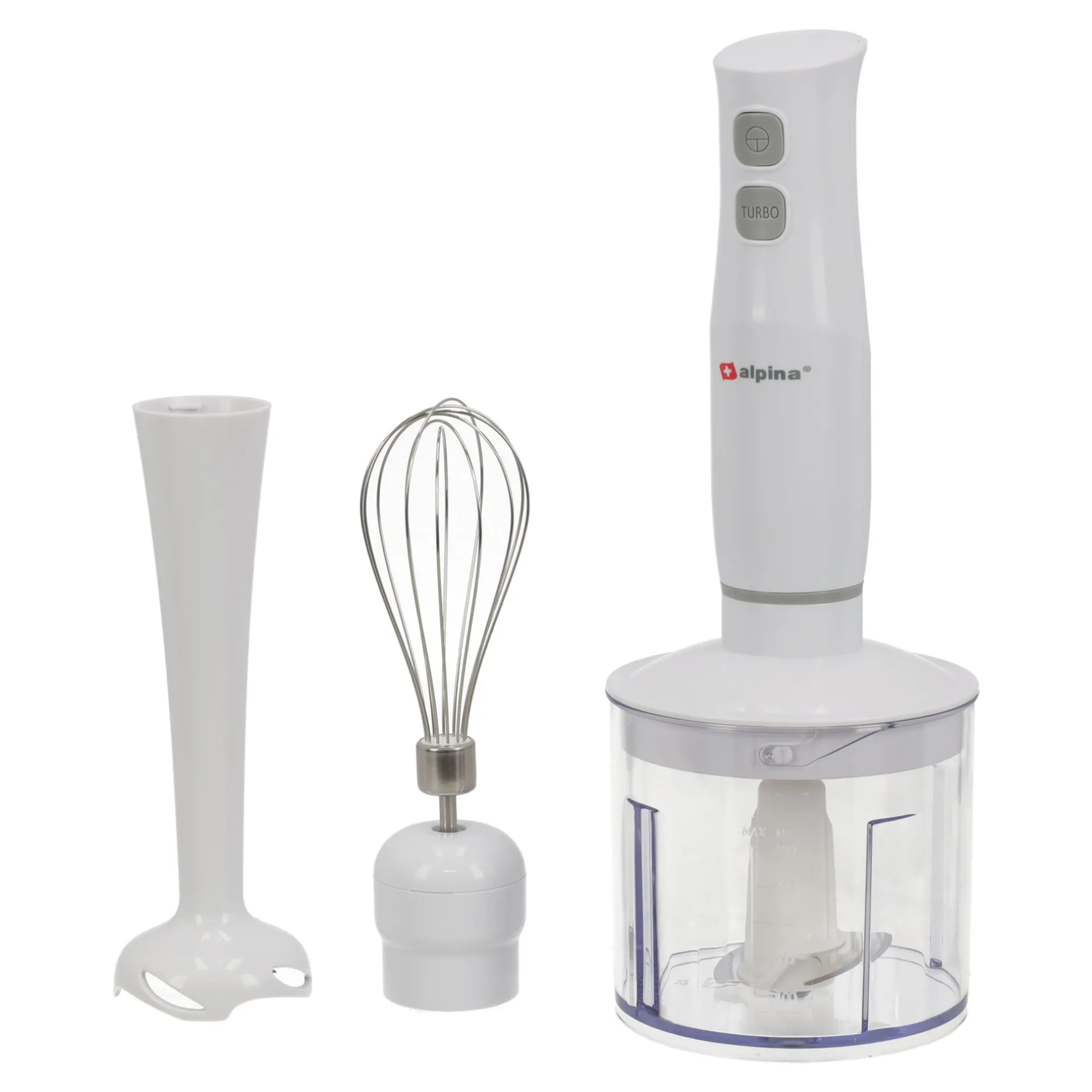 Alpina staafmixer met pureeropzetstuk, garde en vleesmolen, multifunctioneel voor het bereiden van diverse gerechten.