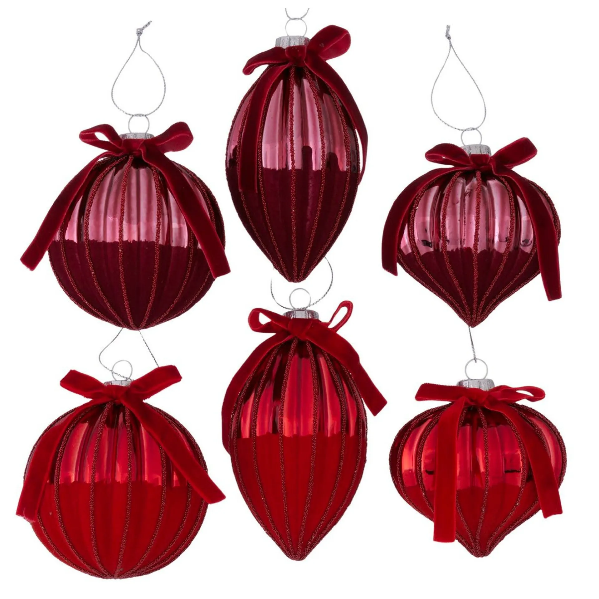 Chique glazen hangers met fluwelen details en glitteraccenten, met sierstrik en ophang lus. Elegante blikvanger in de kerstboom, verkrijgbaar in zes verschillende uitvoeringen.