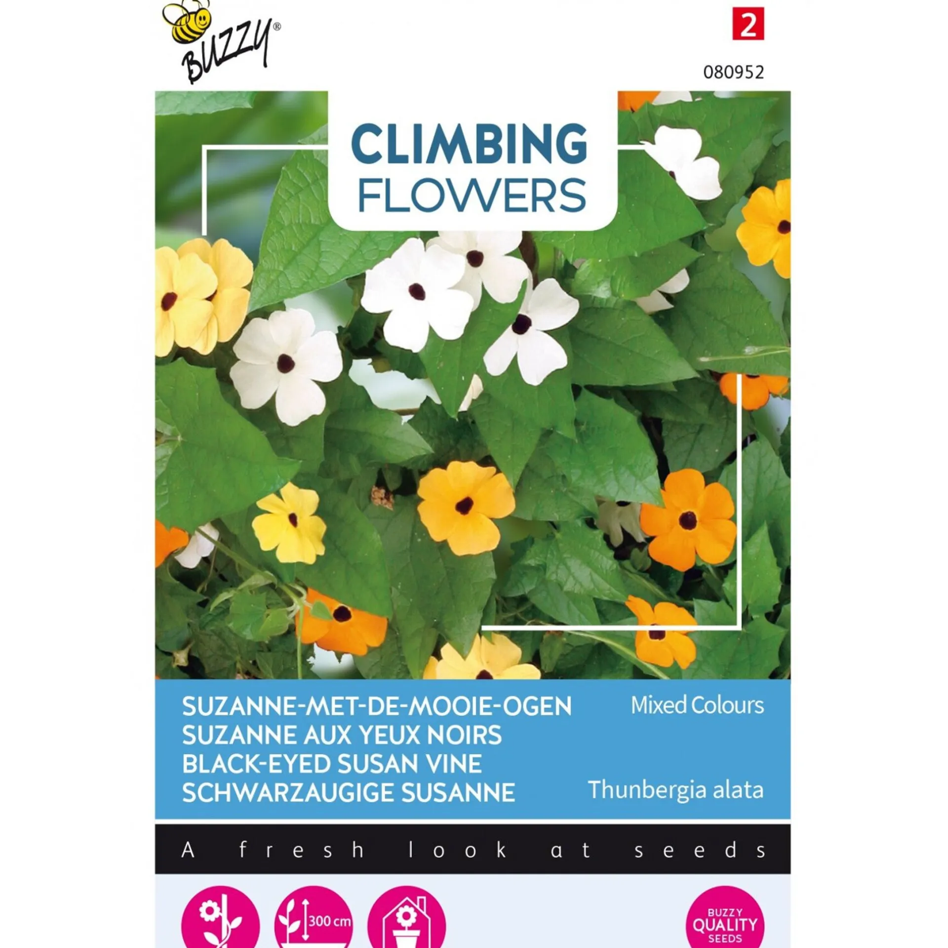 Een kleurrijke Thunbergia-mix van snelgroeiende klimplanten met opvallende bloemen in geel, oranje en wit. Ideaal voor hekwerken, pergola’s en balkonbakken. Rijke bloei van zomer tot herfst.