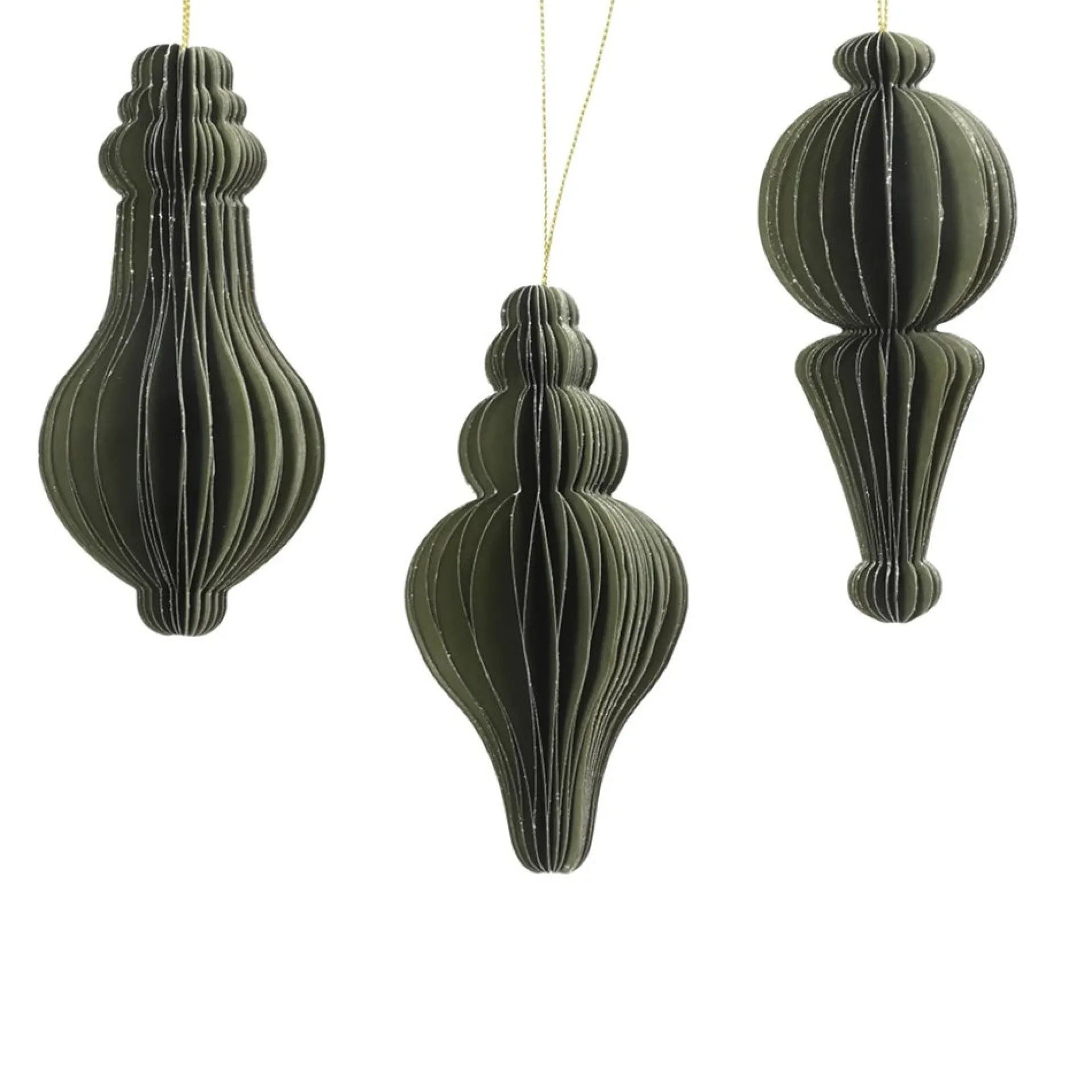 Papieren hanger van 12 cm in donkergroene kleur met elegante geplooide vorm. Deze decoratie zorgt voor een moderne en natuurlijke uitstraling in de kerstboom en is verkrijgbaar in drie verschillende modellen.