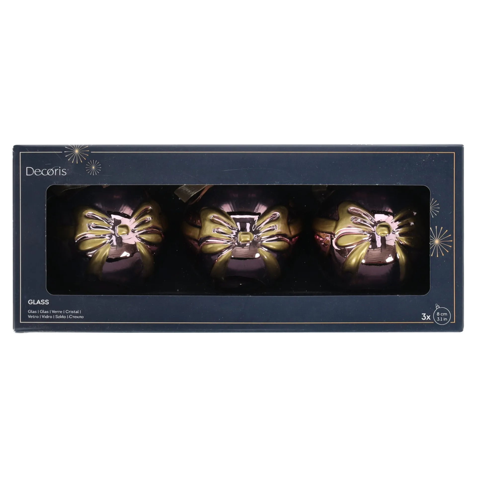 Drie glazen kerstballen in roze kleur en goudkleurige strik in reliƫf, perfect voor wie van een chique en eigentijdse kerstdecoratie houdt. Reflecteert prachtig de boomverlichting.
