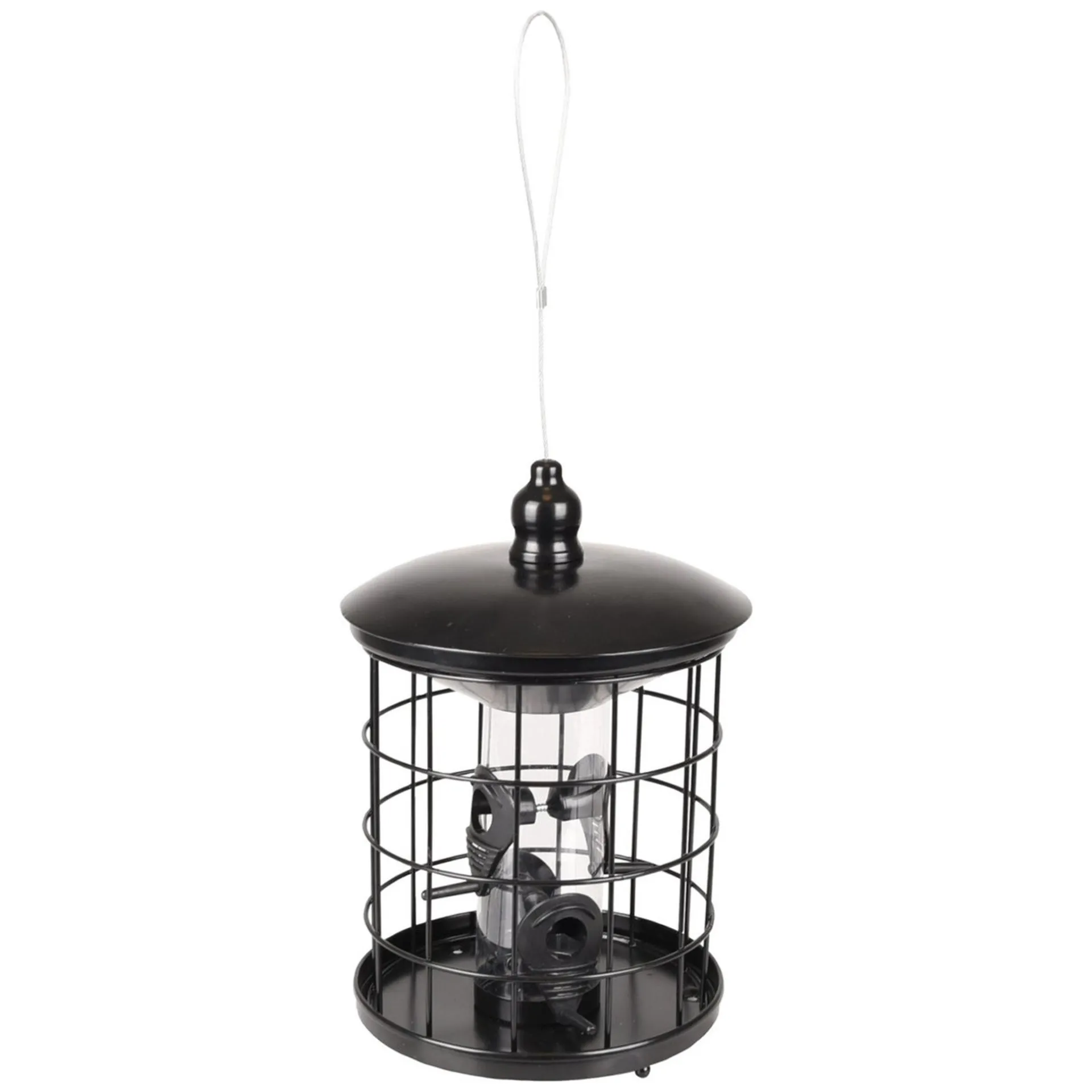 Zwarte metalen vogelvoedersilo met beschermkooi en transparant reservoir. Geschikt voor zaden en eenvoudig op te hangen.