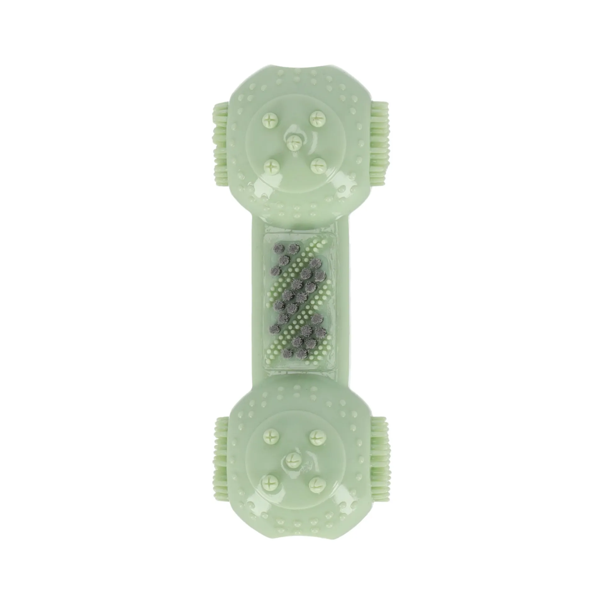 De is een stevig en veelzijdig kauwspeeltje, perfect voor middelgrote honden. Deze halter is gemaakt van thermoplastisch rubber (thermoplastisch rubber), een duurzaam en flexibel materiaal dat bestand is tegen intensief kauwen. Het ontwerp met textuur zorgt voor een goede grip, terwijl het kauwen op de halter helpt om de tanden schoon te houden en het tandvlees te masseren.