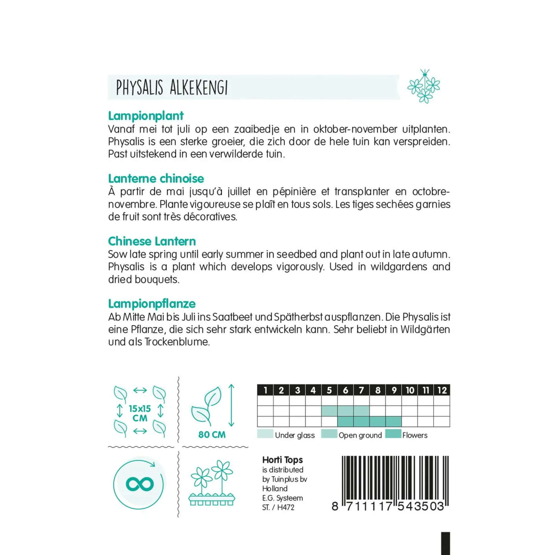 Sierlijke vaste plant met opvallende oranje lampionvruchten. Ideaal voor in de tuin en als snijbloem. Zaaien in het voorjaar, bloeit in de zomer.