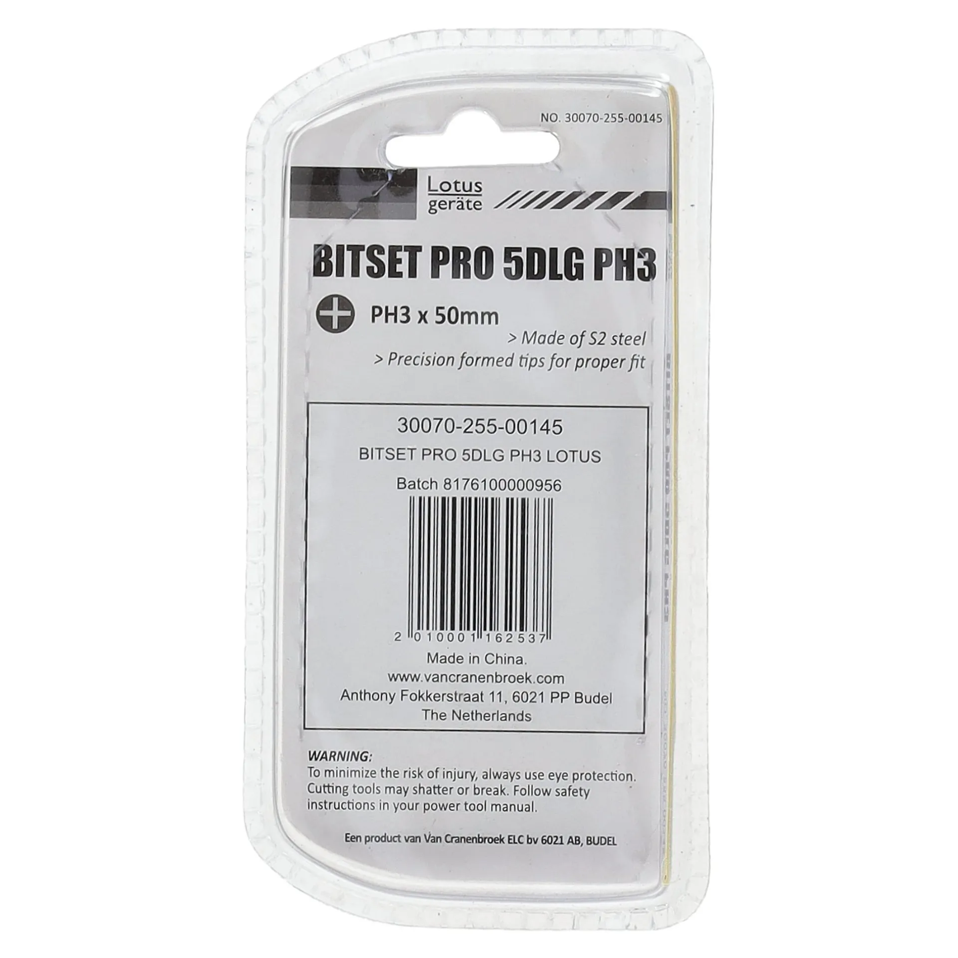 Deze Lotus Geräte bitset Pro 5-delig bestaat uit vijf PH3-bits met een lengte van 50 mm. De bits zijn gemaakt van S2-staal en bedoeld voor het werken met Phillips-schroeven. Ze zijn geschikt voor gebruik met zowel schroefmachines als handgereedschap en worden geleverd in een overzichtelijke blisterverpakking.