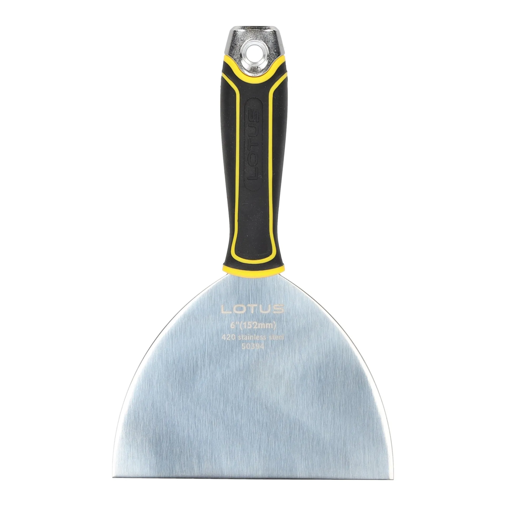 Professioneel Lotus plamuur- en afsteekmes van 152 mm met flexibel roestvast stalen blad en comfortabele softgrip handgreep, perfect voor brede plamuurwerken en het snel verwijderen van verf- en lijmresten.
