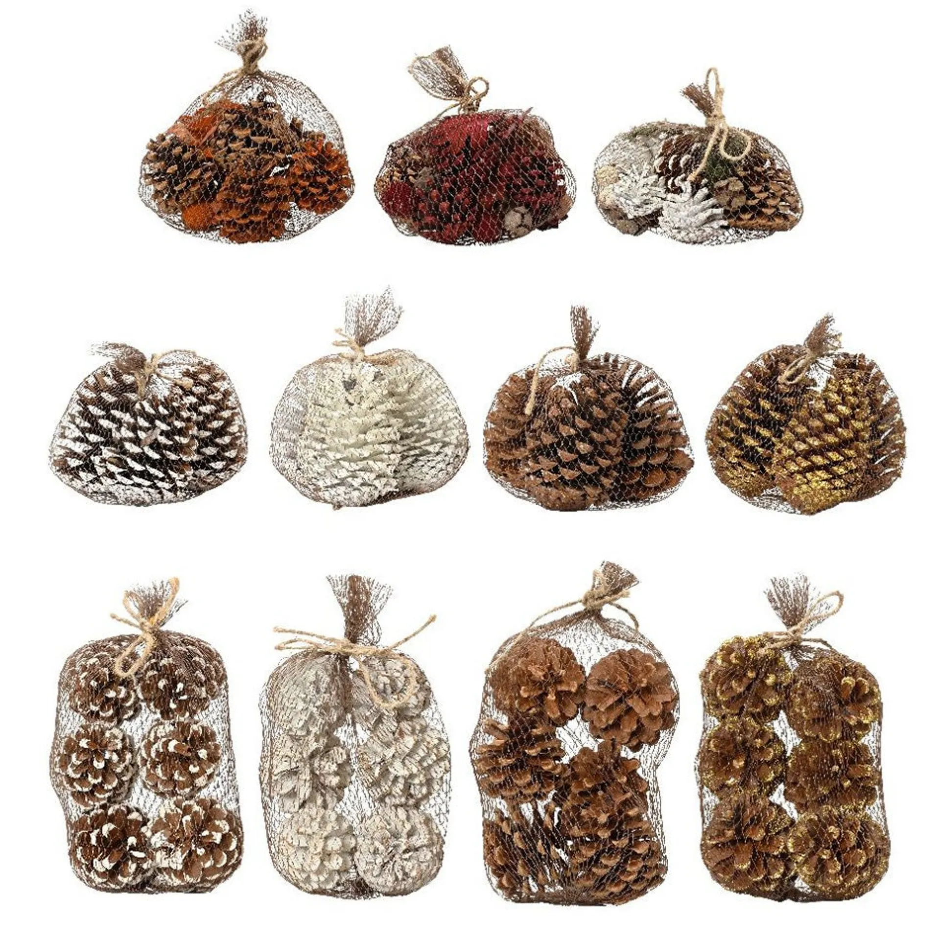 Set met dennenappels in netverpakking, ideaal als natuurlijke kerstdecoratie. Geschikt voor gebruik in schalen, kransen of als versiering in de kerstboom voor een warme en sfeervolle uitstraling.