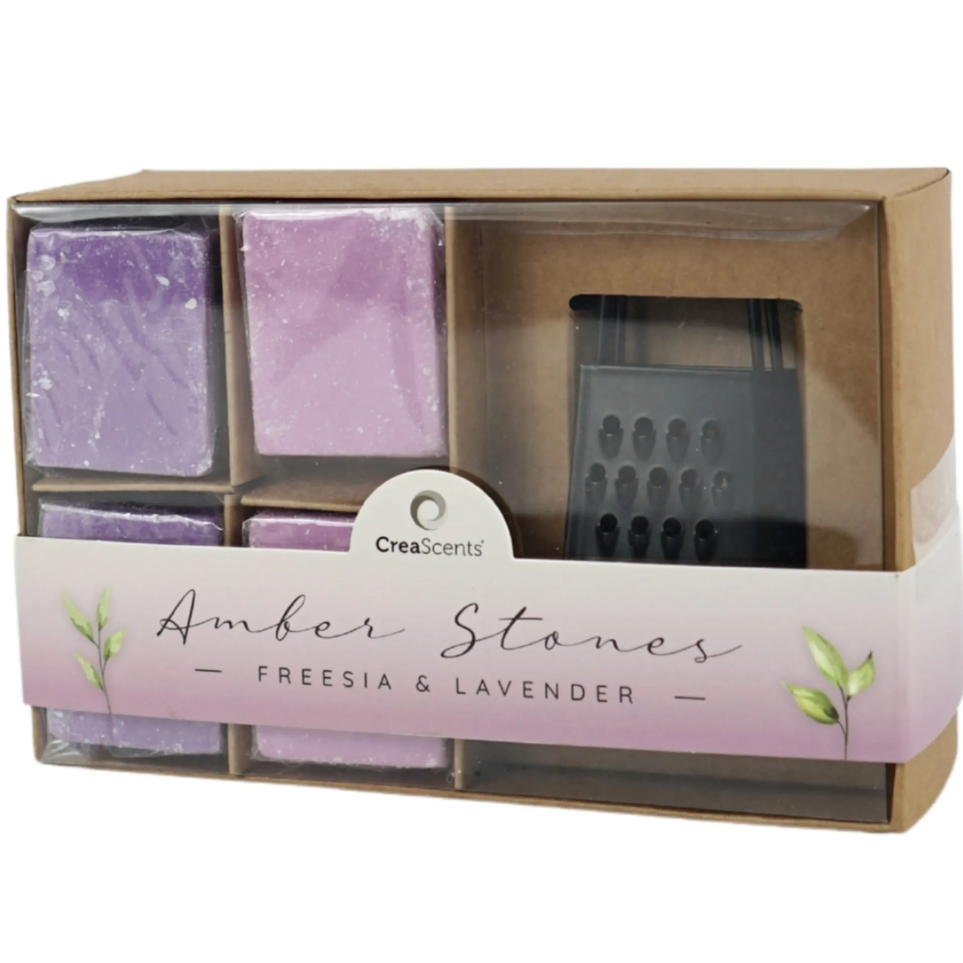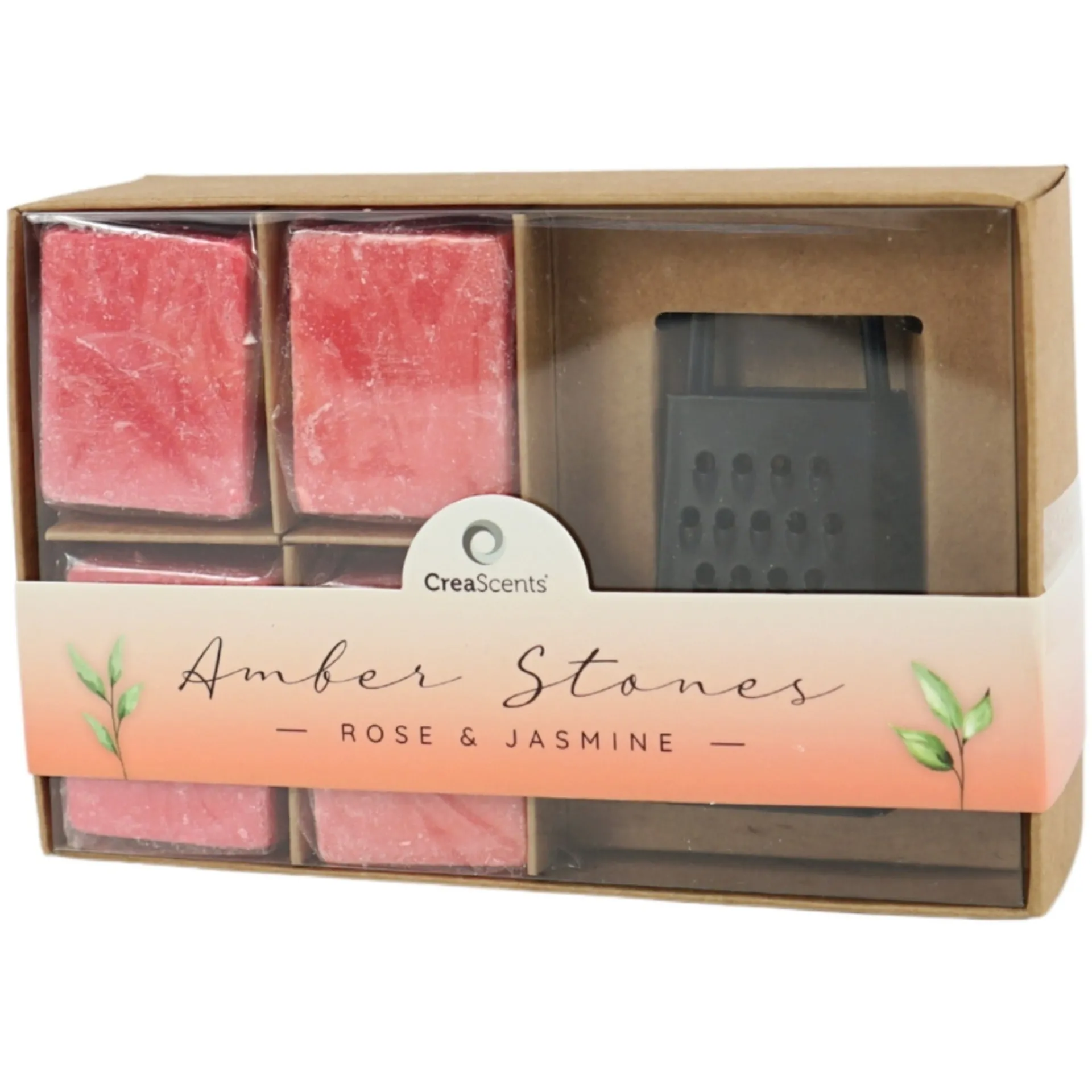 Set van vier amberblokjes met een handige rasp. Verkrijgbaar in drie varianten en ideaal om een heerlijke geur in huis te verspreiden.