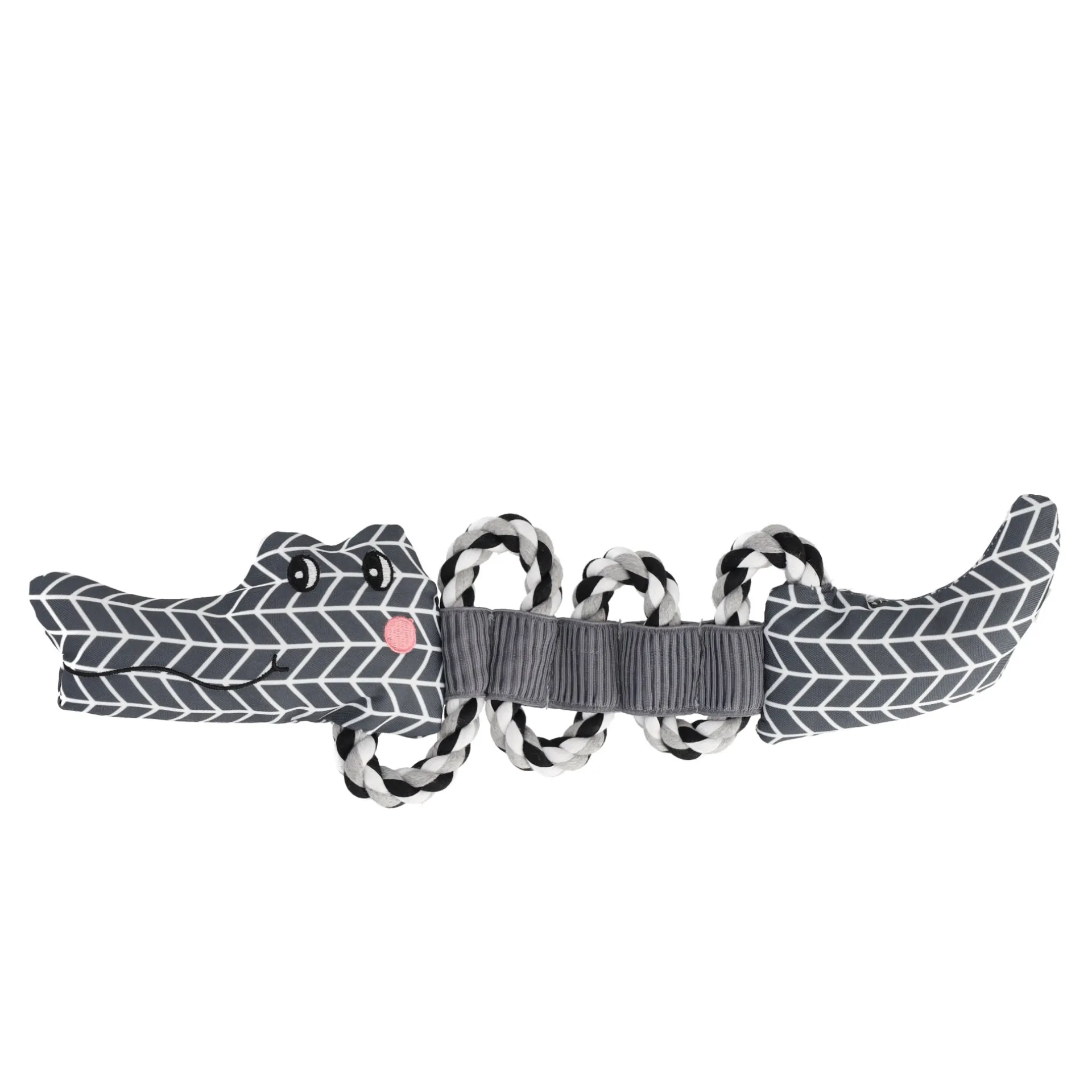Een groot en knuffelbaar hondenspeeltje in de vorm van een grijze krokodil, ontworpen voor middelgrote tot grote honden. Met een lengte van 44 cm biedt dit speeltje genoeg ruimte voor honden om het vast te pakken, mee te schudden en erop te kauwen.