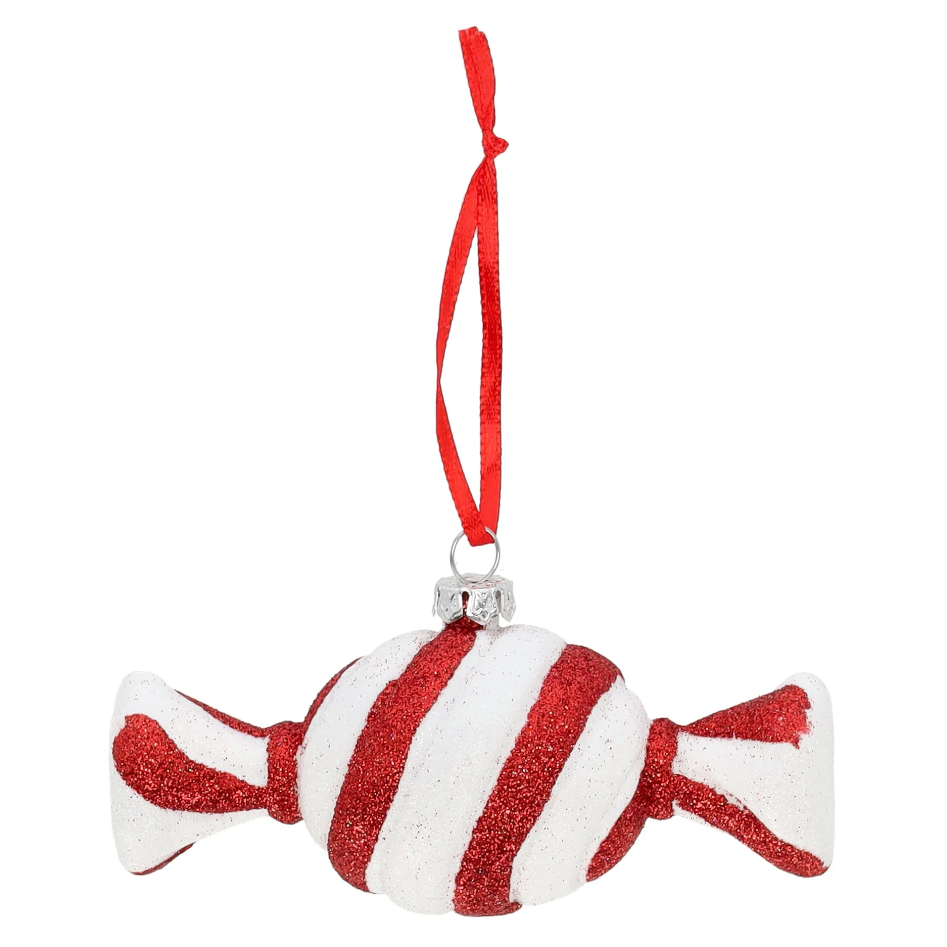 Vrolijke kersthanger in de vorm van een rood-wit gestreept snoepje, rijkelijk afgewerkt met glitters. Met het rode ophanglint hang je deze decoratie gemakkelijk in de kerstboom of aan een andere feestelijke tak.