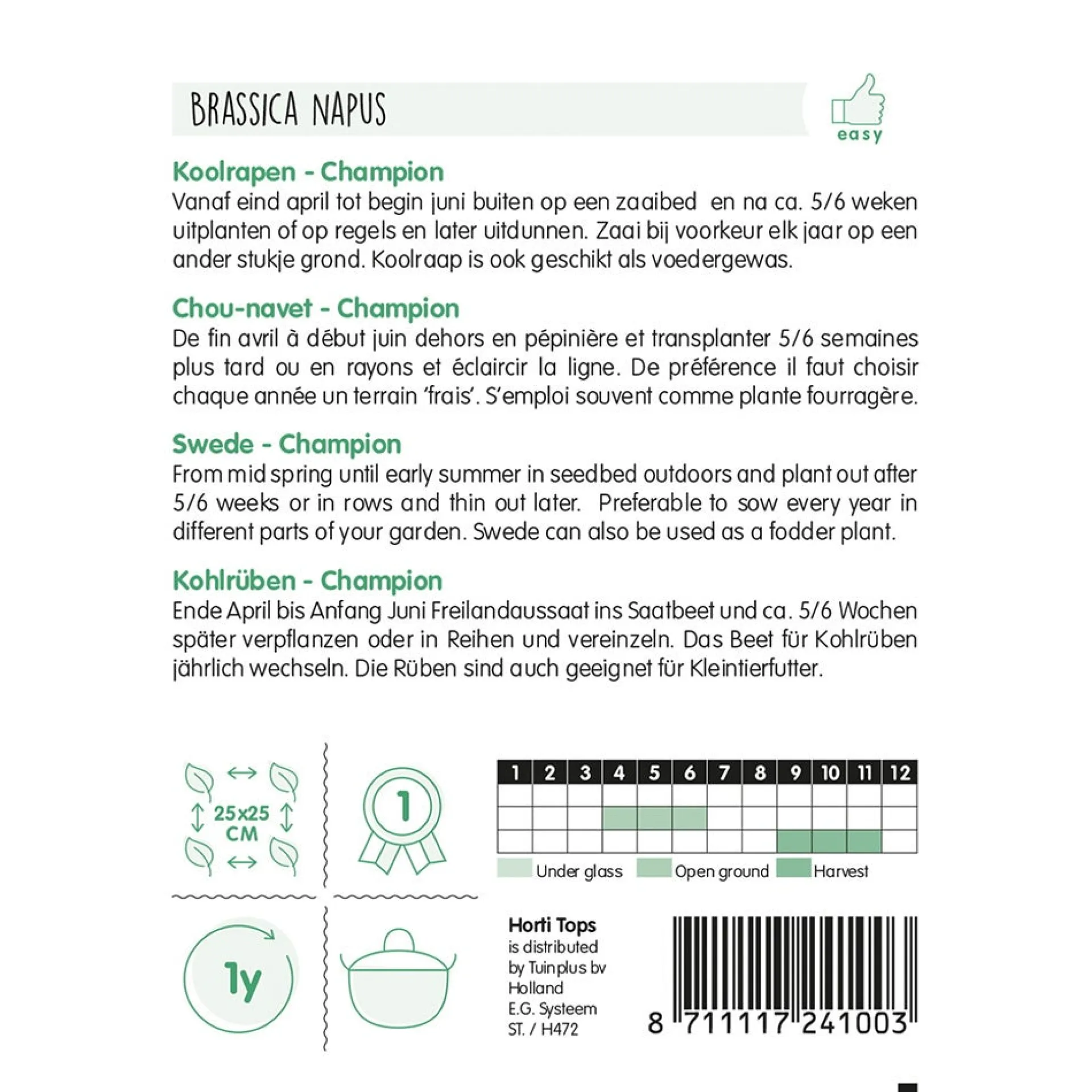 Koolraap Championis een klassiek ras dat bekend staat om zijn zachte, gele knolvlees en goede smaak. De knollen hebben een paarsachtige schil en zijn geschikt voor diverse bereidingen zoals soepen, puree en ovengerechten. Ook het jonge blad kan gegeten worden als snijmoes.