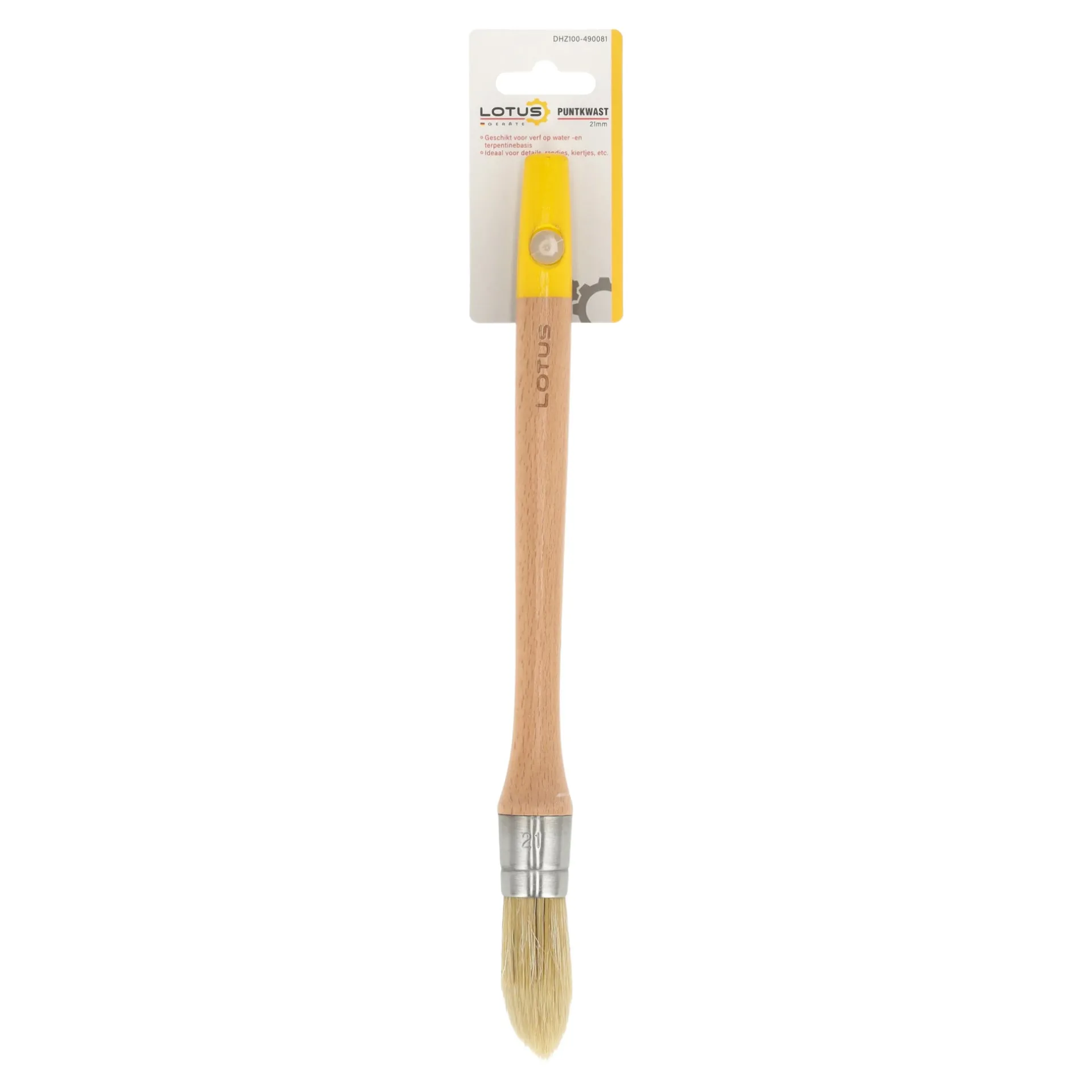 Puntkwast van Lotus met een breedte van 21 mm. Universeel inzetbaar voor nauwkeurig schilderwerk, zoals randen, hoeken en details. De lange houten steel zorgt voor goede controle tijdens het werken, ook op moeilijke te bereiken plekken.