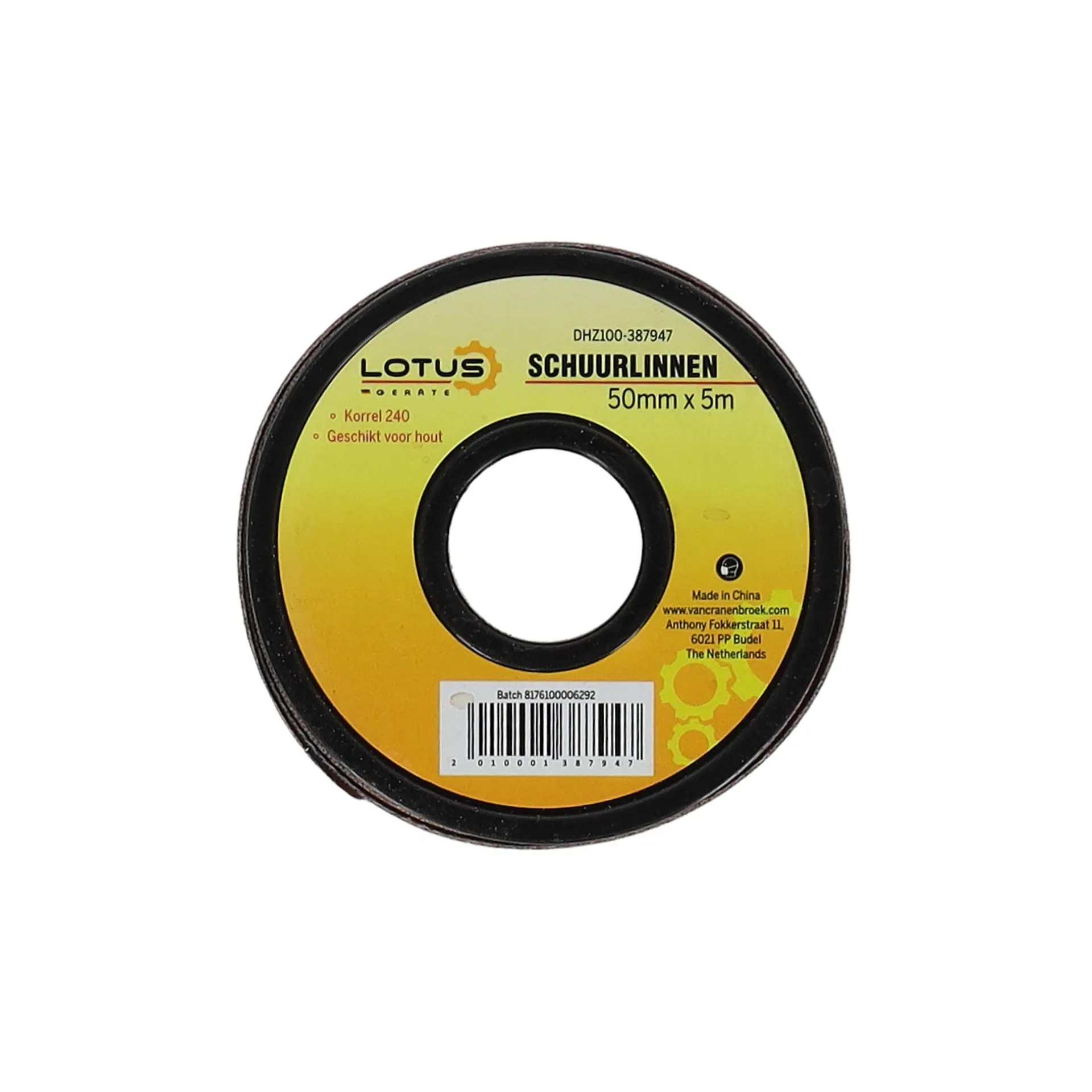 Schuurlinnen op rol Lotus 50 mm x 5 m met korrel 240, geschikt voor fijn schuurwerk op hout.