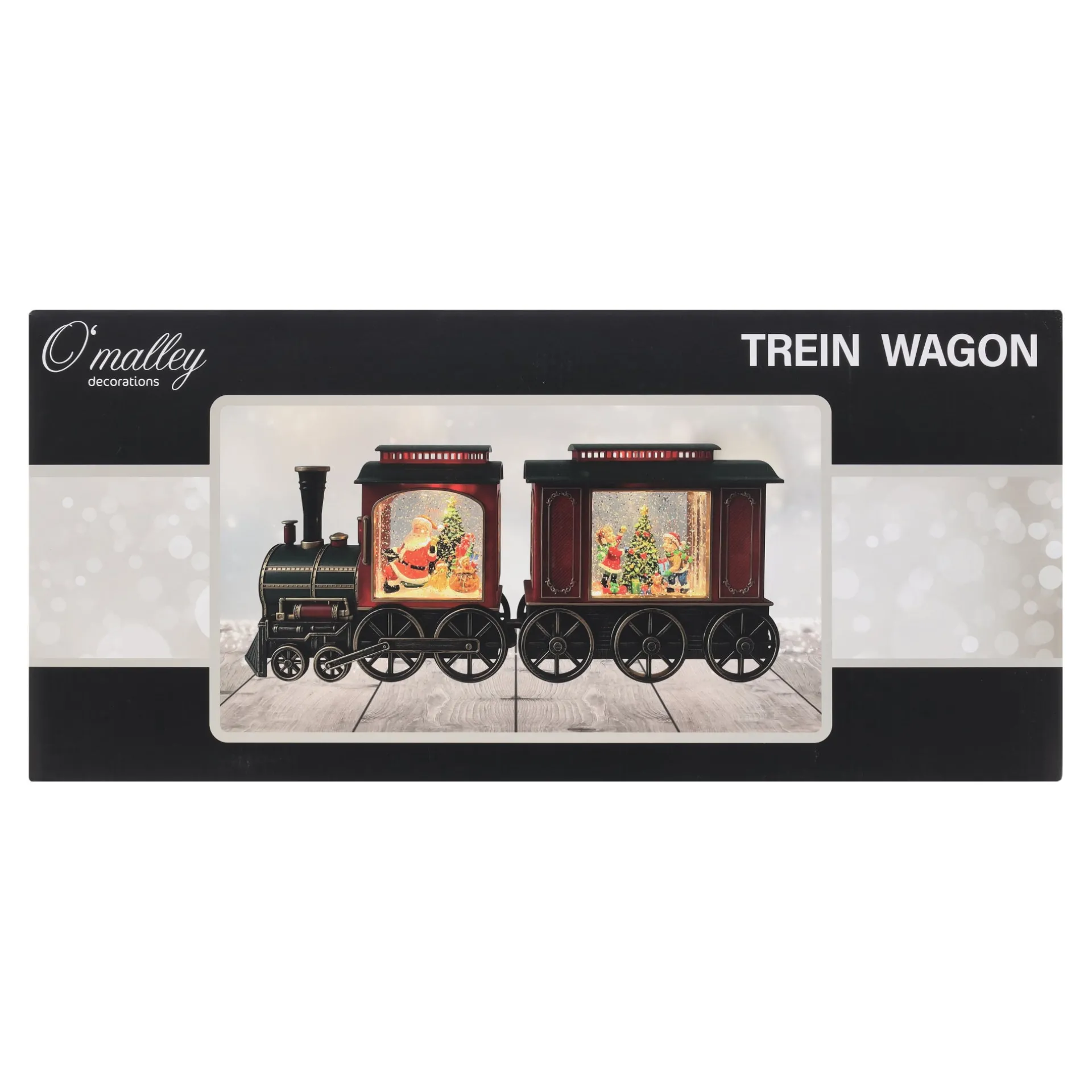 Decoratieve kersttrein met wagon met een totale lengte van 48 cm, uitgevoerd in rood-groene tinten met gezellige kerstscĆØnes. De voorstellingen worden extra opgeleukt door licht en ronddwarrelende glitters en het geheel is ontworpen voor gebruik binnenshuis.